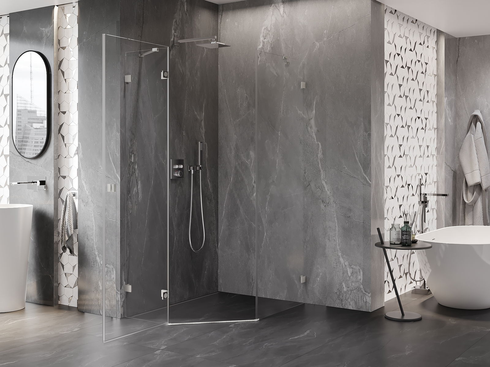 Skavas un eņģes ir izgatavotas no ļoti izturīga misiņa un papildus veido vienā līmenī esošu stikla virsmu. Tas ir lieliska izvēle, kas apvieno eleganci, izturību un modernu dizainu. Šādi risinājumi paaugstina dušas estētiku un vienlaikus atvieglo tīrības uzturēšanu.