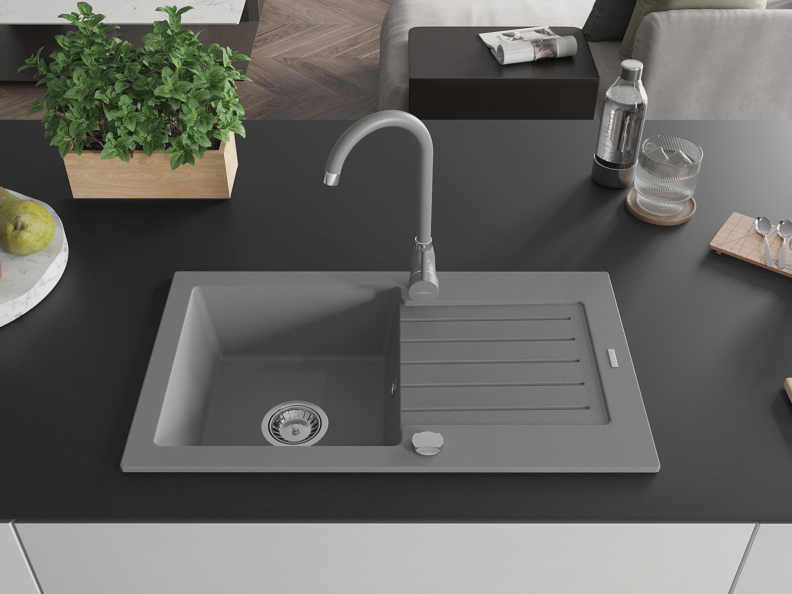Mexen Pablo granīta izlietne ar vienu bļodu un noteku un virtuves krānu Telma, pelēka - 6510-71-670200-71