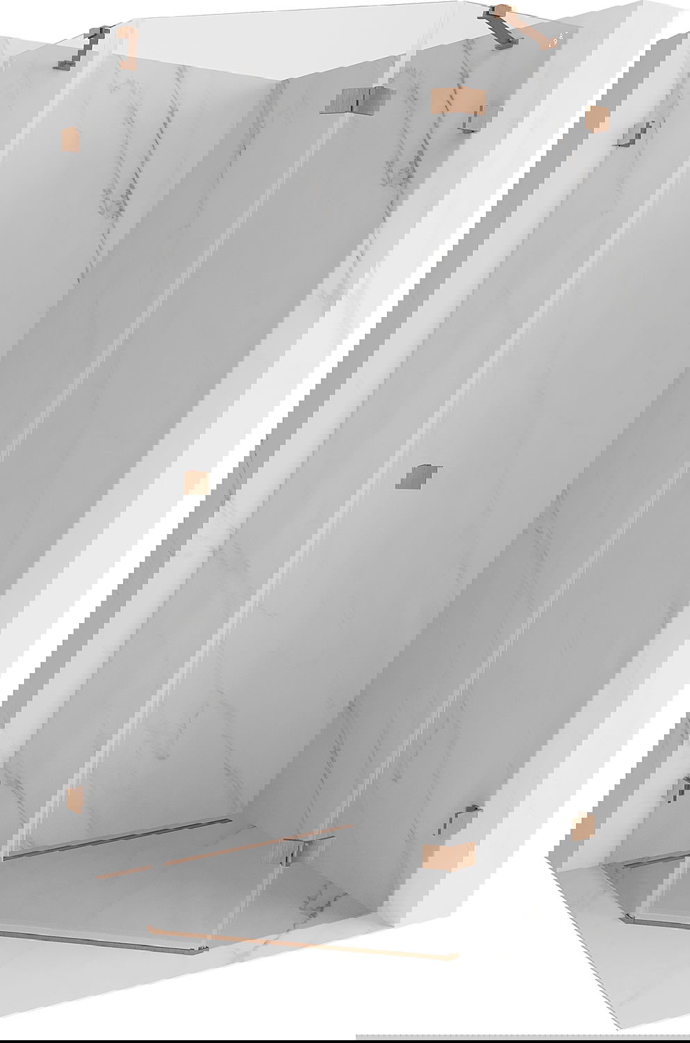 Skavas un eņģes ir izgatavotas no ļoti izturīga misiņa un papildus veido vienā līmenī esošu stikla virsmu. Tas ir lieliska izvēle, kas apvieno eleganci, izturību un modernu dizainu. Šādi risinājumi paaugstina dušas estētiku un vienlaikus atvieglo tīrības uzturēšanu.
