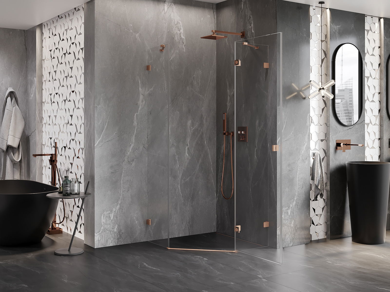Skavas un eņģes ir izgatavotas no ļoti izturīga misiņa un papildus veido vienā līmenī esošu stikla virsmu. Tas ir lieliska izvēle, kas apvieno eleganci, izturību un modernu dizainu. Šādi risinājumi paaugstina dušas estētiku un vienlaikus atvieglo tīrības uzturēšanu.
