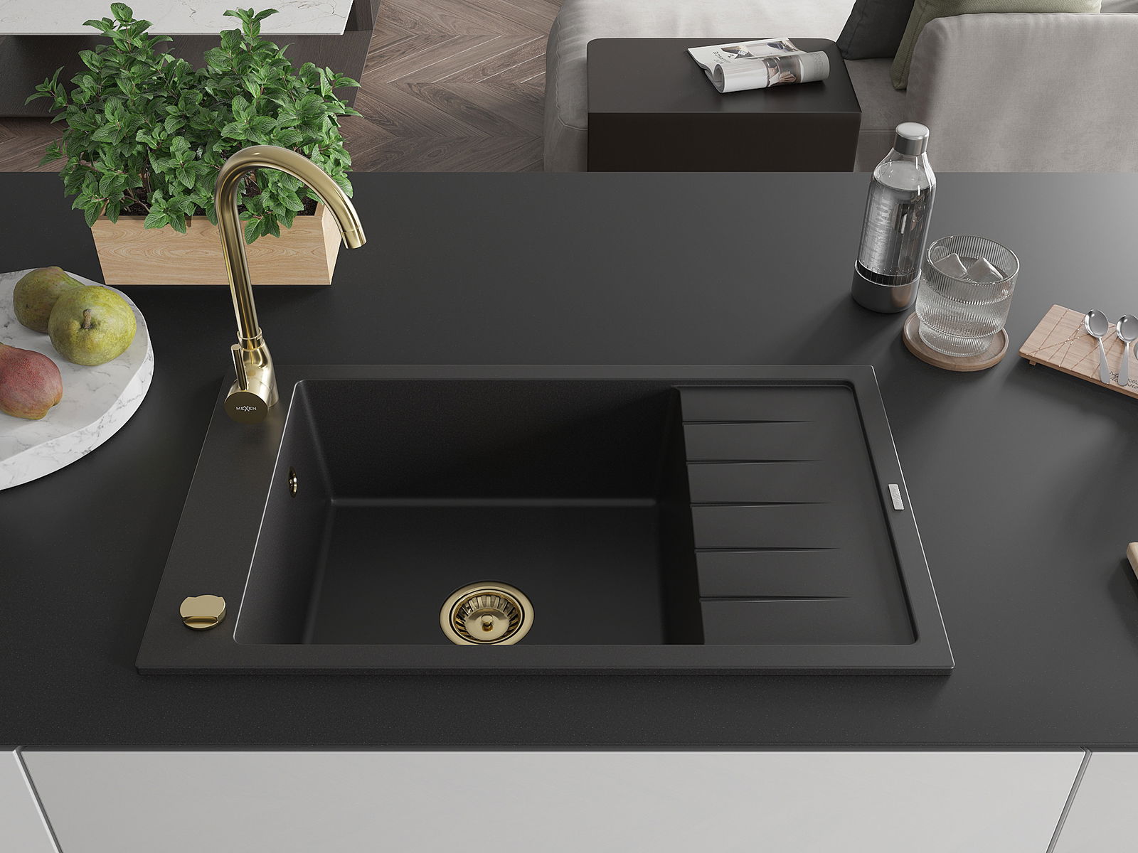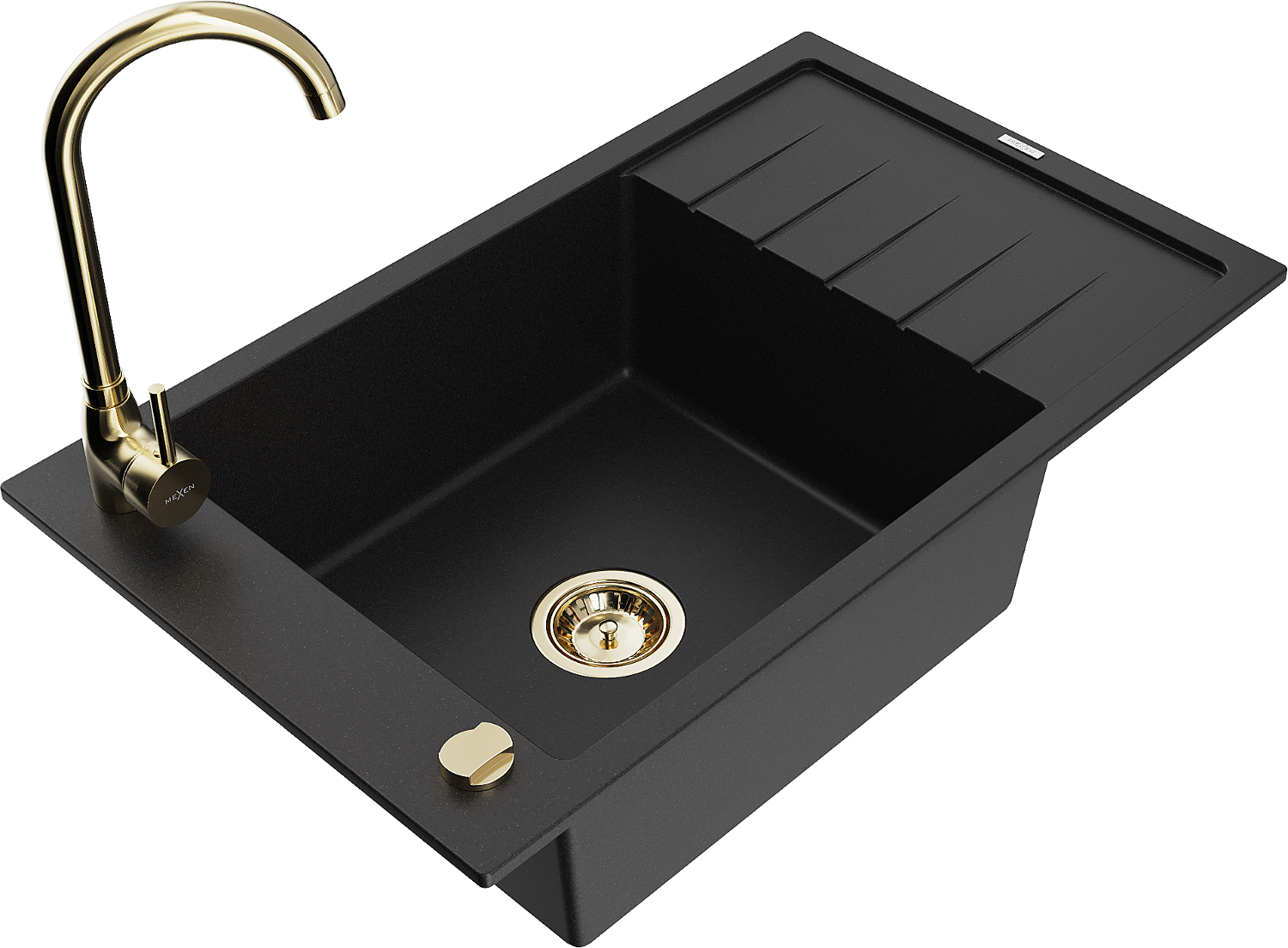 Mexen Elias granit izlietne ar vienu nodalījumu, noteces paliktni un virtuves jaucējkrānu Telma, melna - 6511-77-670200-50