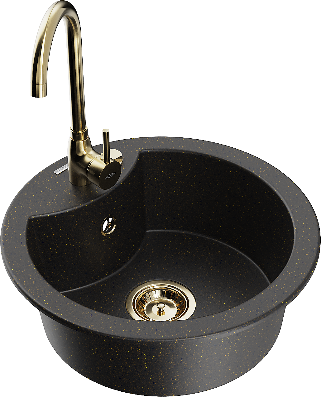 Mexen Diego granitē izlietne ar vienu nodalījumu un virtuves jaucējkrānu Telma, melna/zeltaina - 6512-75-670200-50
