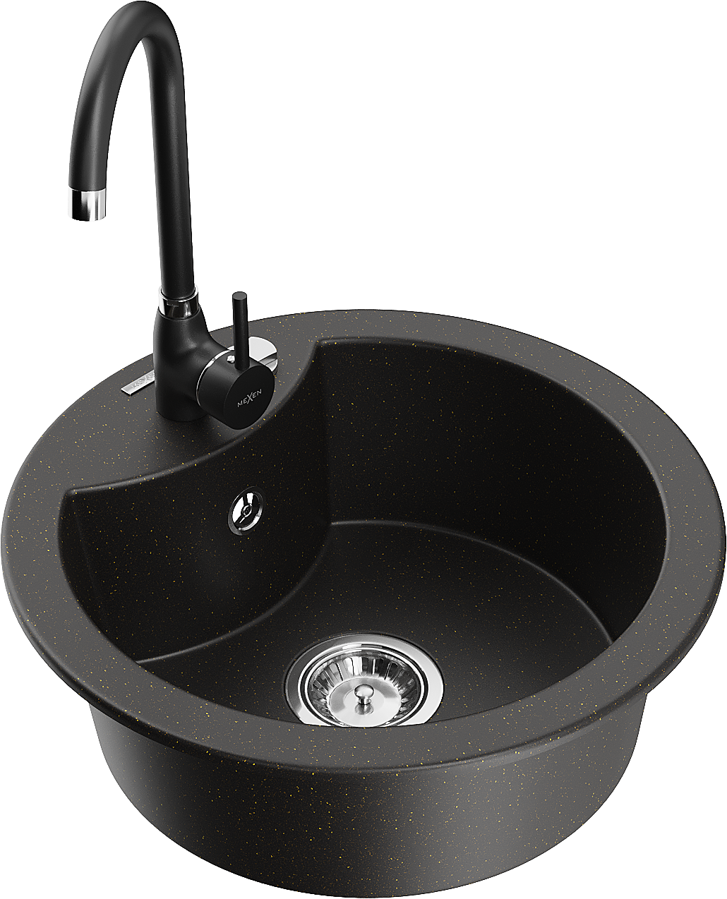 Mexen Diego granīta virtuves izlietne ar vienu kameru un virtuves maisītāju Telma, melns/zeltīts - 6512-75-670200-70