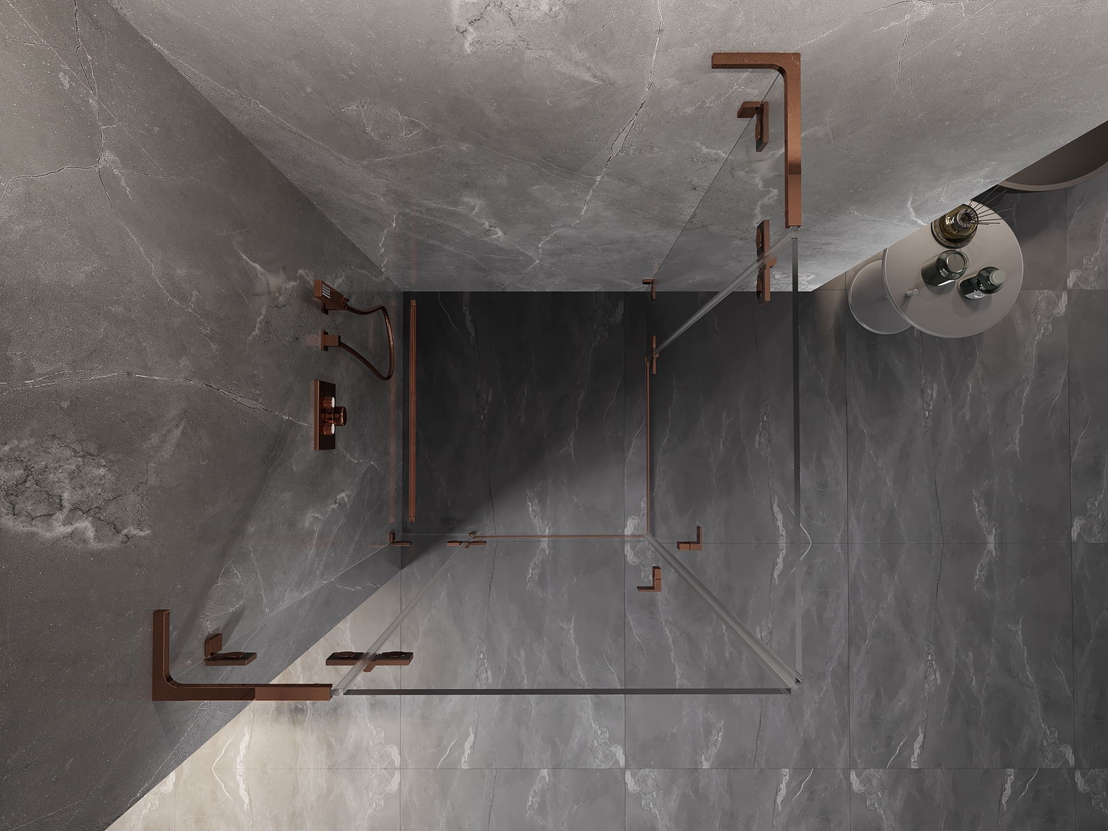 Skavas un eņģes ir izgatavotas no ļoti izturīga misiņa un papildus veido vienā līmenī esošu stikla virsmu. Tas ir lieliska izvēle, kas apvieno eleganci, izturību un modernu dizainu. Šādi risinājumi paaugstina dušas estētiku un vienlaikus atvieglo tīrības uzturēšanu.