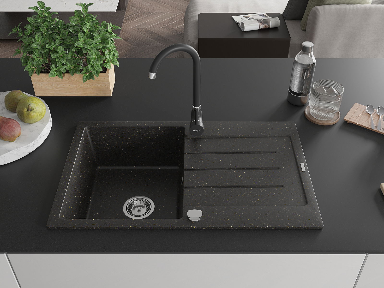 Mexen Bruno vienkameras granīta izlietne ar noteku un virtuves jaucējkrānu Telma, melna/zeltīta - 6513-75-670200-70