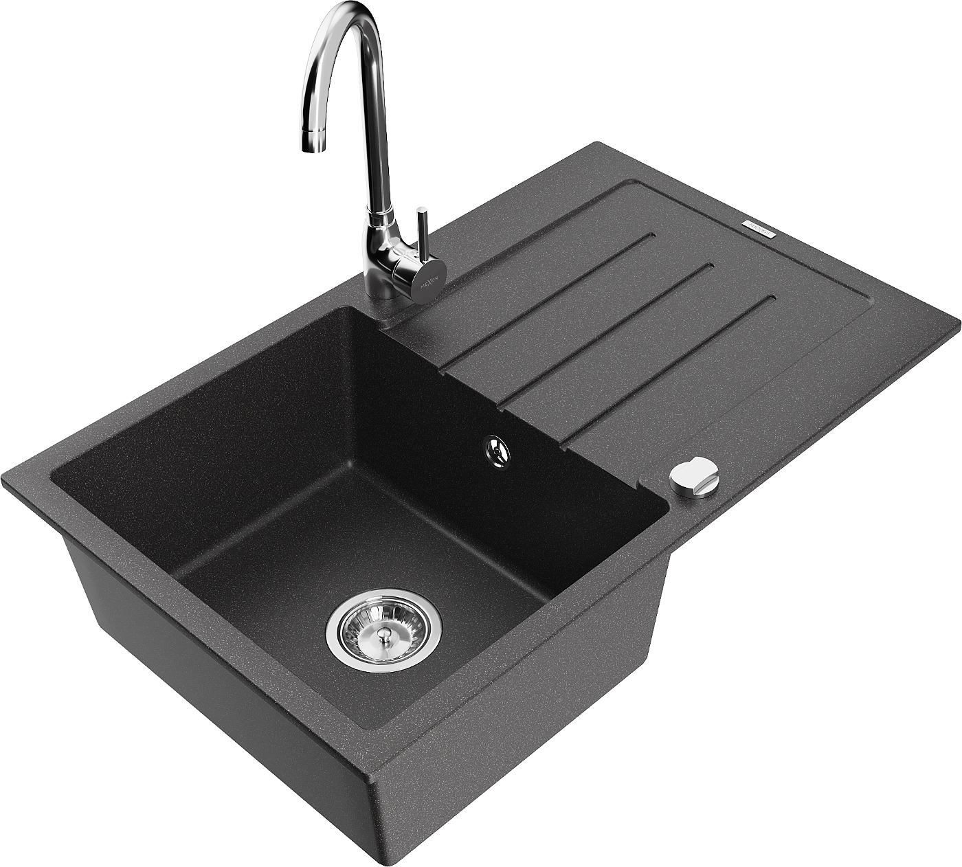 Mexen Bruno granitizlietne 1 nodalījuma izlietne ar žāvētāju un Virtuves jaucējkrānu Telma, melna ar plankumiem