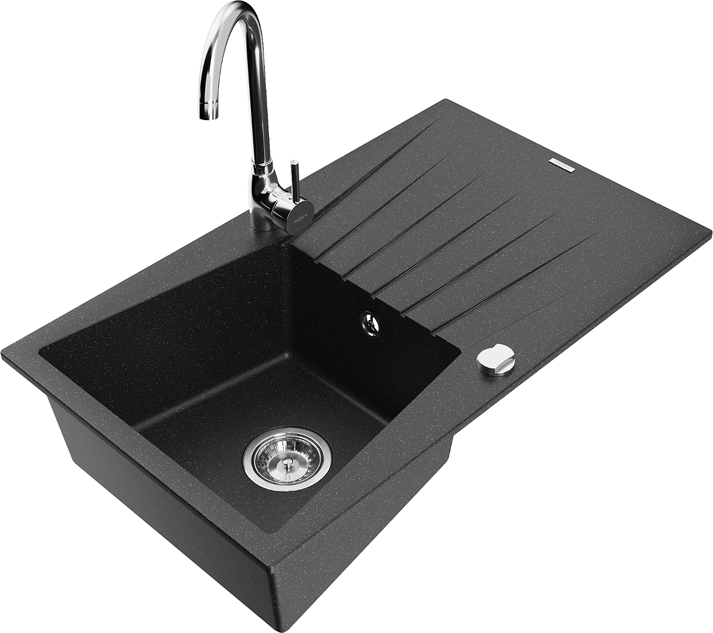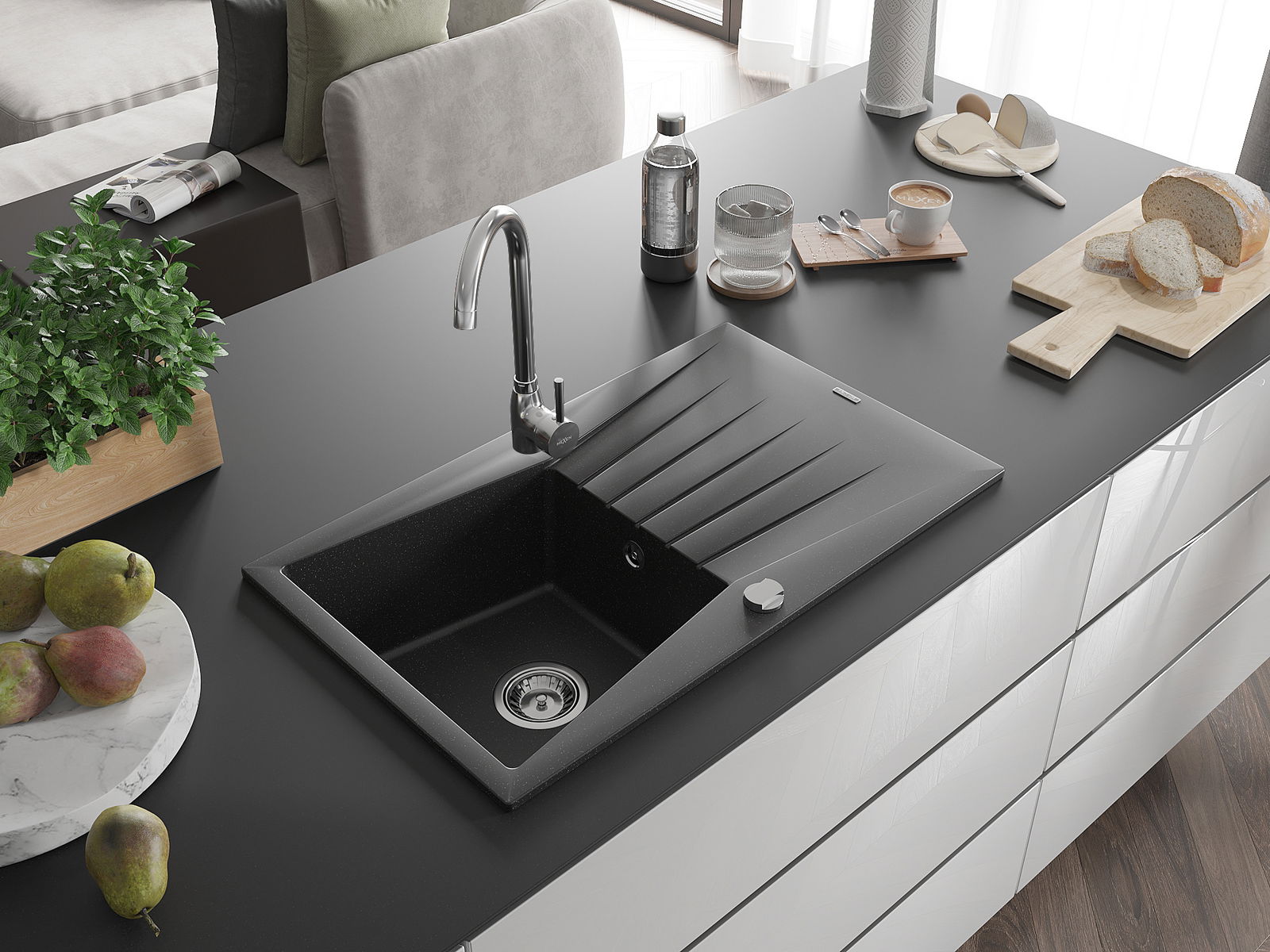Mexen Cesar granitizlietne ar vienu nodalījumu ar noteces zonu un virtuves jaucējkrānu Telma, melna/sudraba