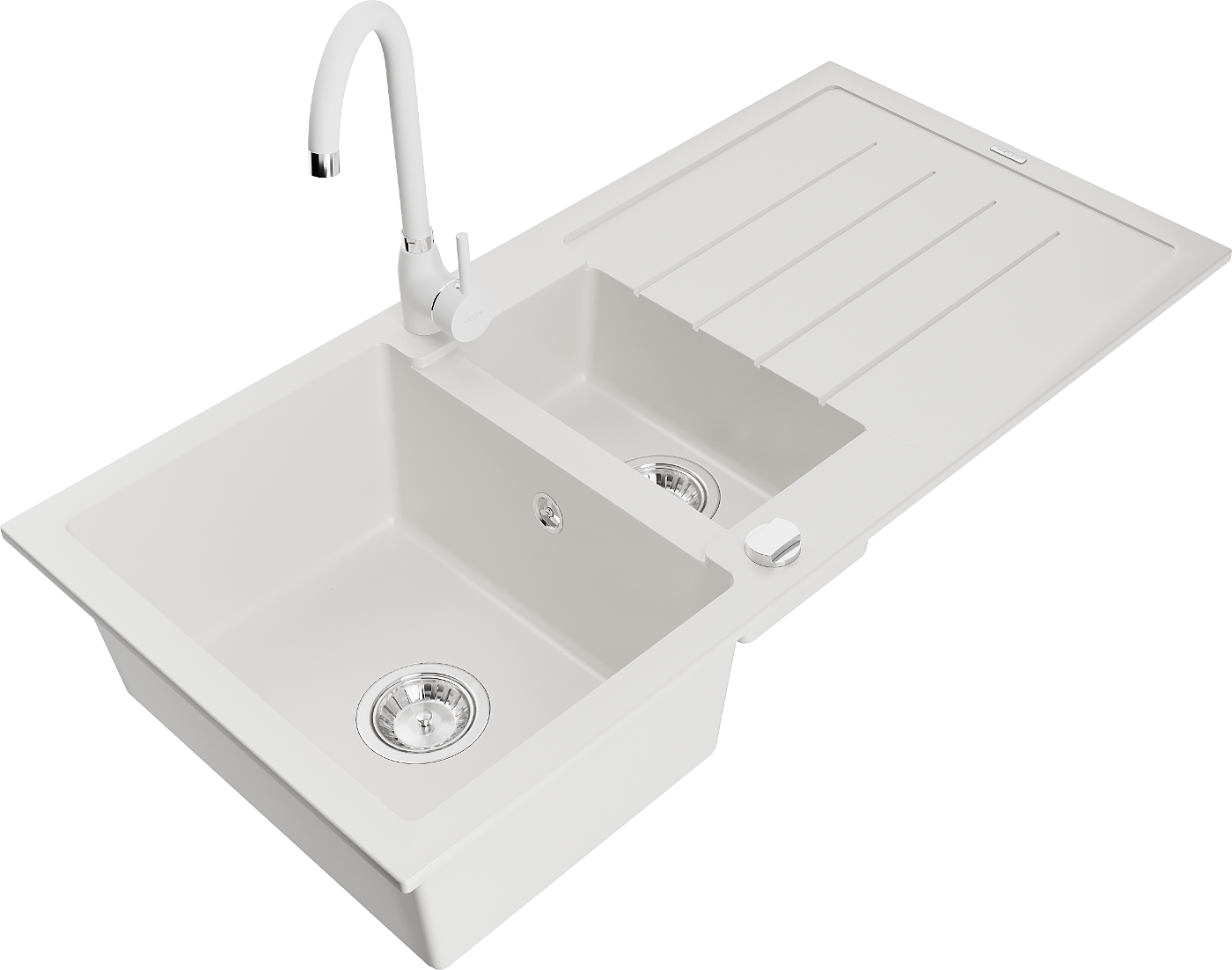 Mexen Andres granitā izlietne ar 1,5 nodalījumiem, ar noteces paliktni un virtuves jaucējkrānu Telma, balts - 6515-20-670200-20