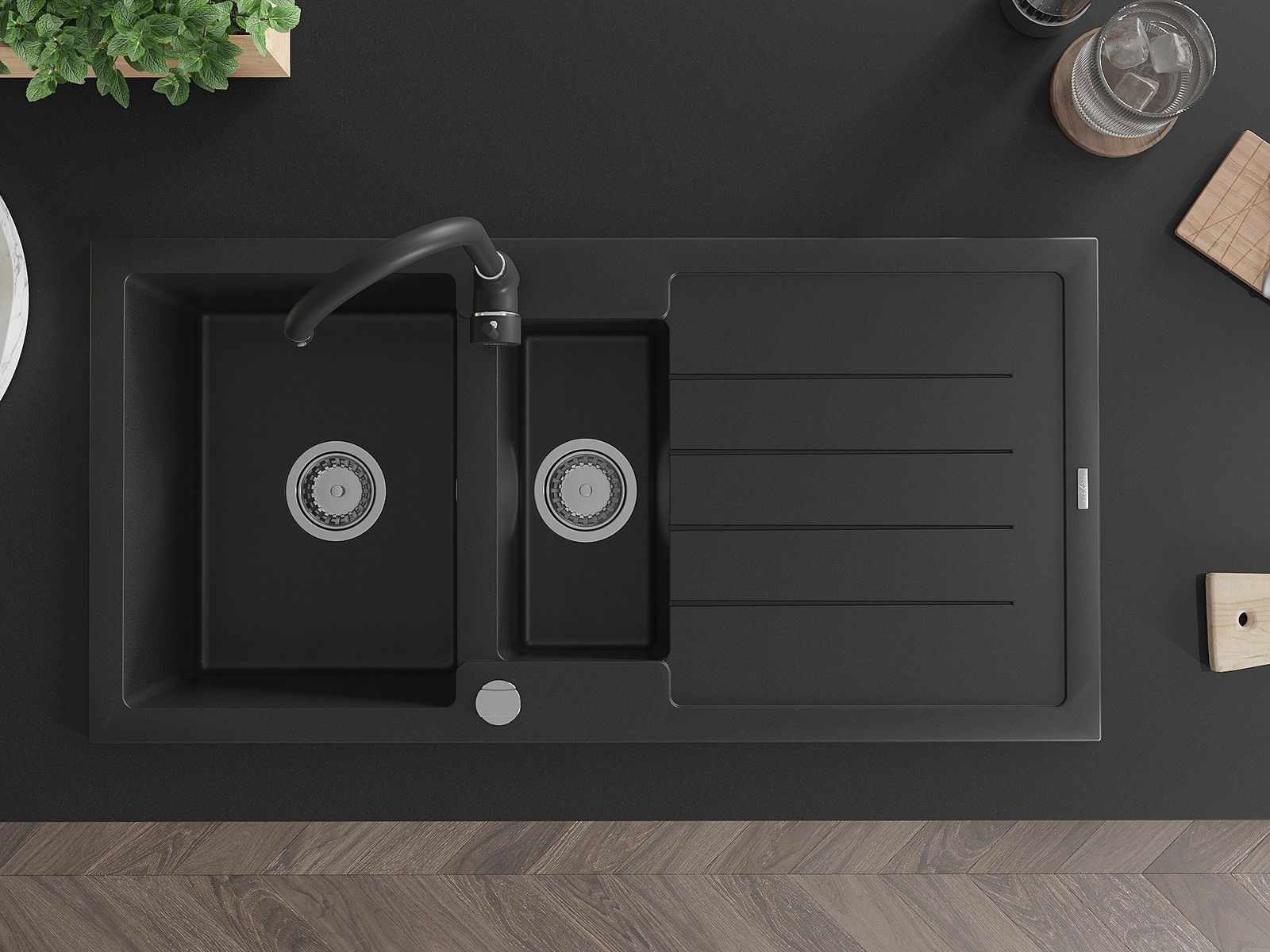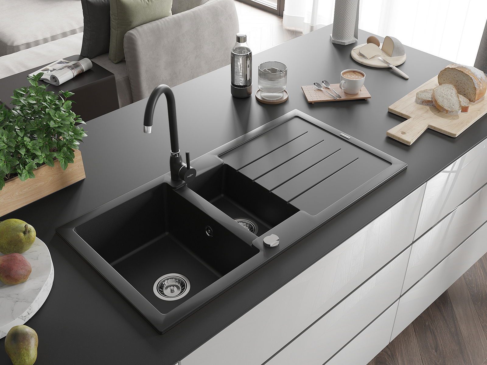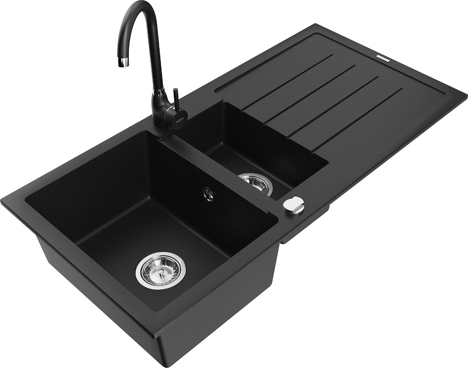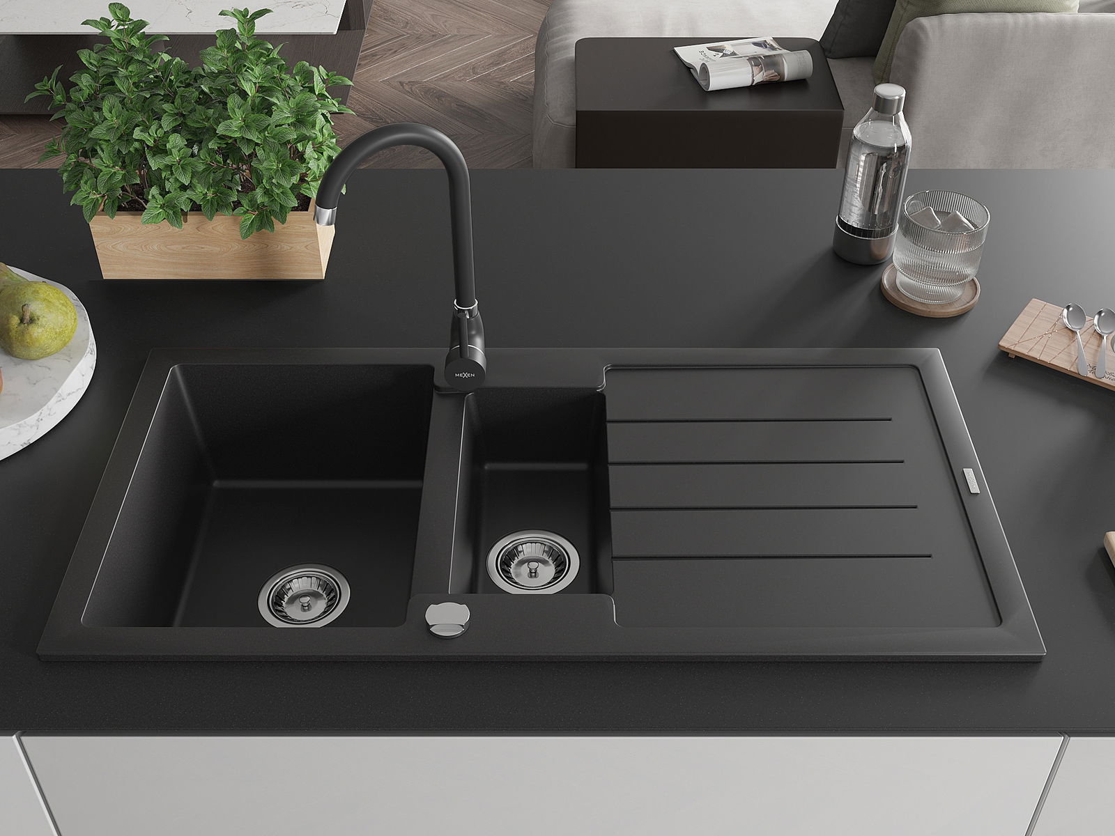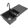 Mexen Andres granīta izlietne ar vienu un pusi bļodu un noteci un virtuves jaucējkrānu Telma, melna - 6515-77-670200-70