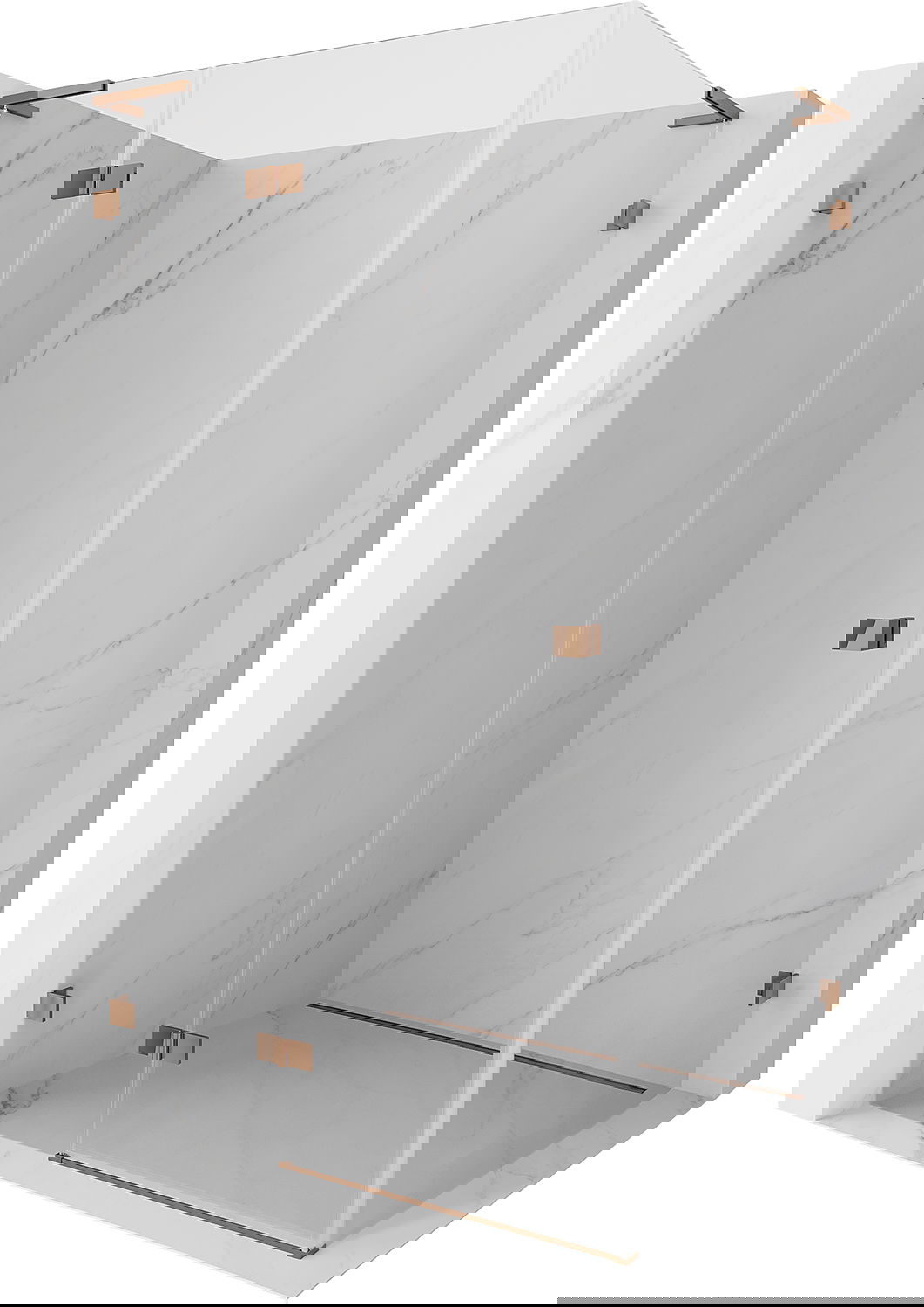 Skavas un eņģes ir izgatavotas no ļoti izturīga misiņa un papildus veido vienā līmenī esošu stikla virsmu. Tas ir lieliska izvēle, kas apvieno eleganci, izturību un modernu dizainu. Šādi risinājumi paaugstina dušas estētiku un vienlaikus atvieglo tīrības uzturēšanu.