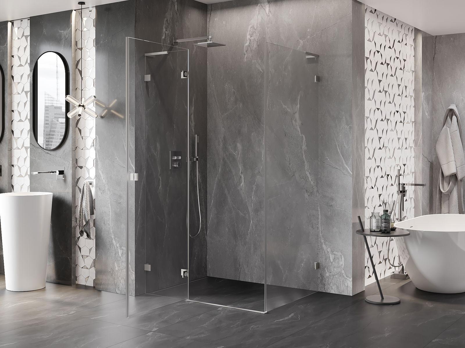 Skavas un eņģes ir izgatavotas no ļoti izturīga misiņa un papildus veido vienā līmenī esošu stikla virsmu. Tas ir lieliska izvēle, kas apvieno eleganci, izturību un modernu dizainu. Šādi risinājumi paaugstina dušas estētiku un vienlaikus atvieglo tīrības uzturēšanu.