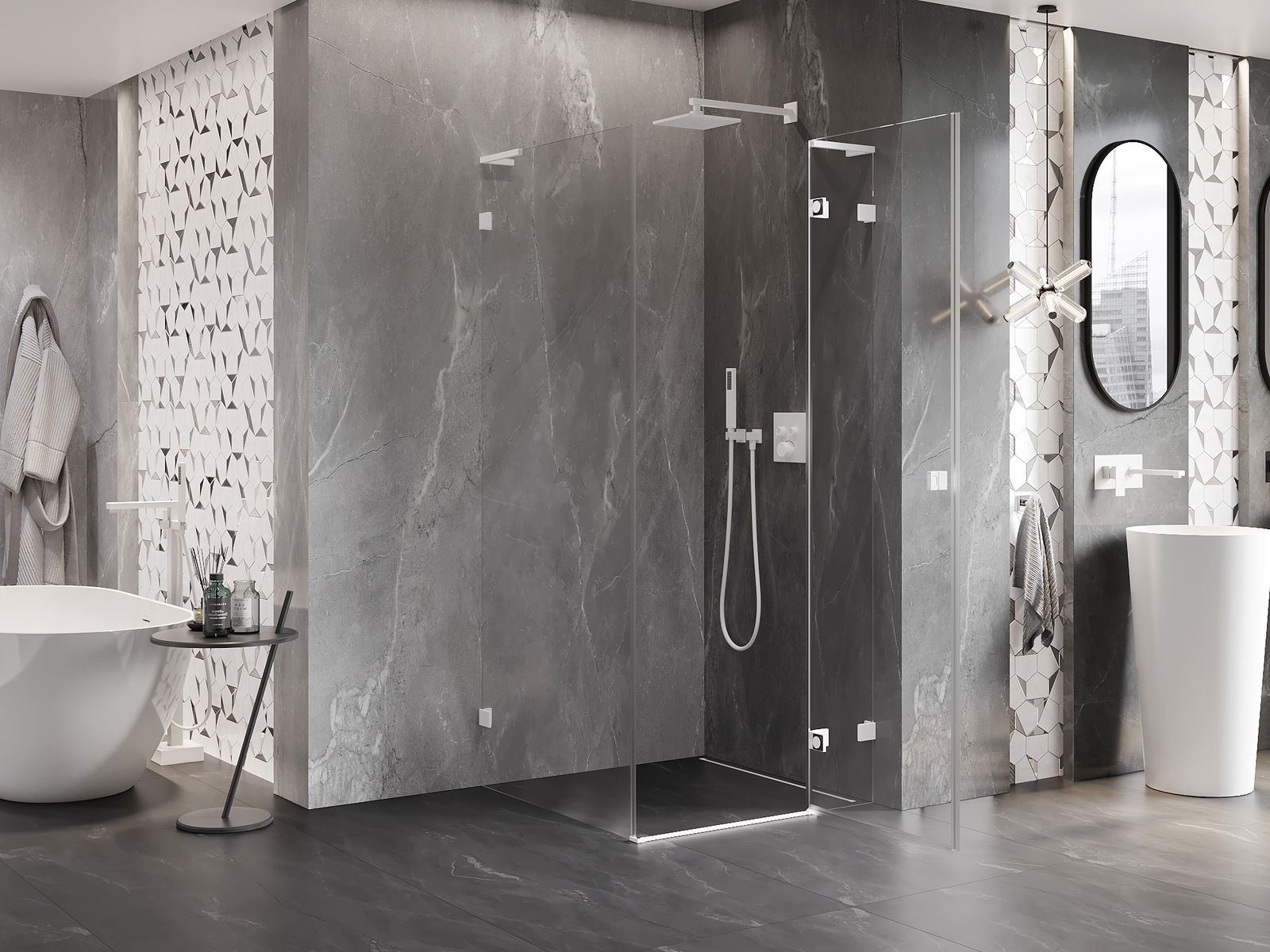 Skavas un eņģes ir izgatavotas no ļoti izturīga misiņa un papildus veido vienā līmenī esošu stikla virsmu. Tas ir lieliska izvēle, kas apvieno eleganci, izturību un modernu dizainu. Šādi risinājumi paaugstina dušas estētiku un vienlaikus atvieglo tīrības uzturēšanu.