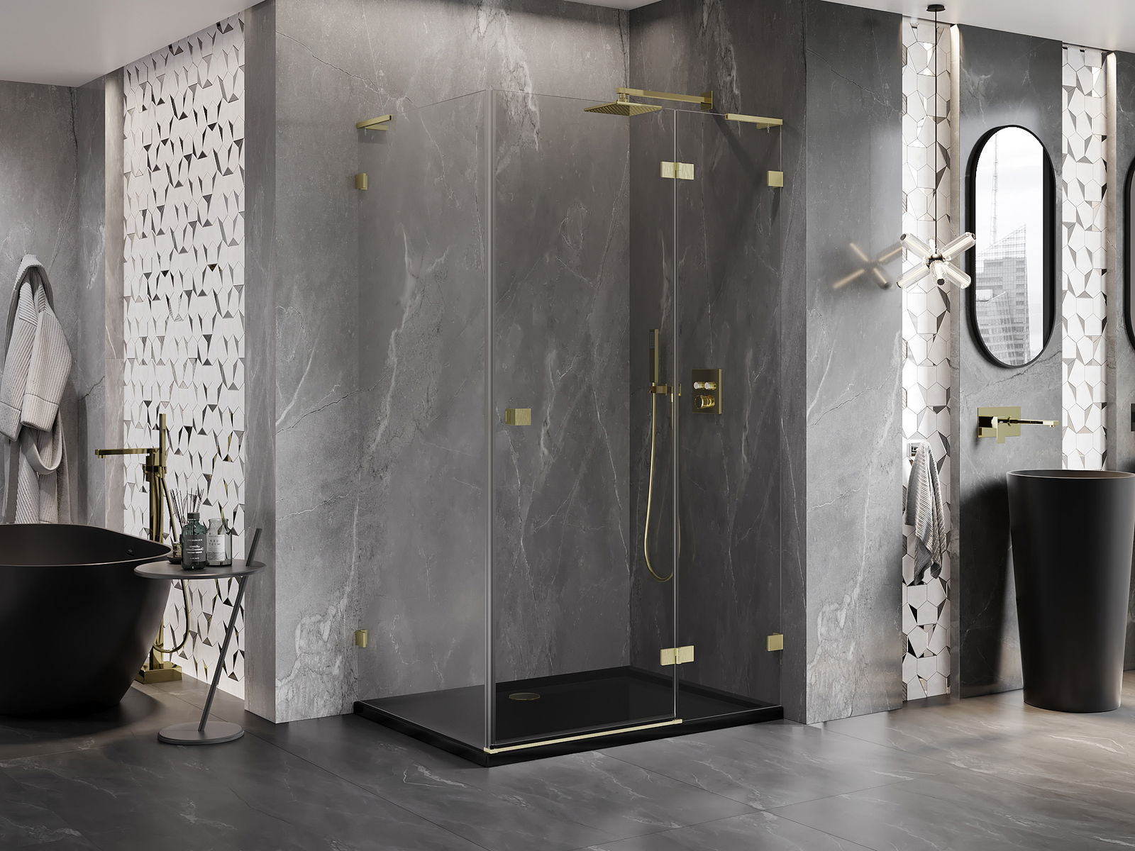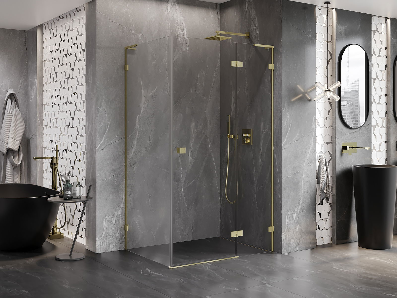 Skavas un eņģes ir izgatavotas no ļoti izturīga misiņa un papildus veido vienā līmenī esošu stikla virsmu. Tas ir lieliska izvēle, kas apvieno eleganci, izturību un modernu dizainu. Šādi risinājumi paaugstina dušas estētiku un vienlaikus atvieglo tīrības uzturēšanu.