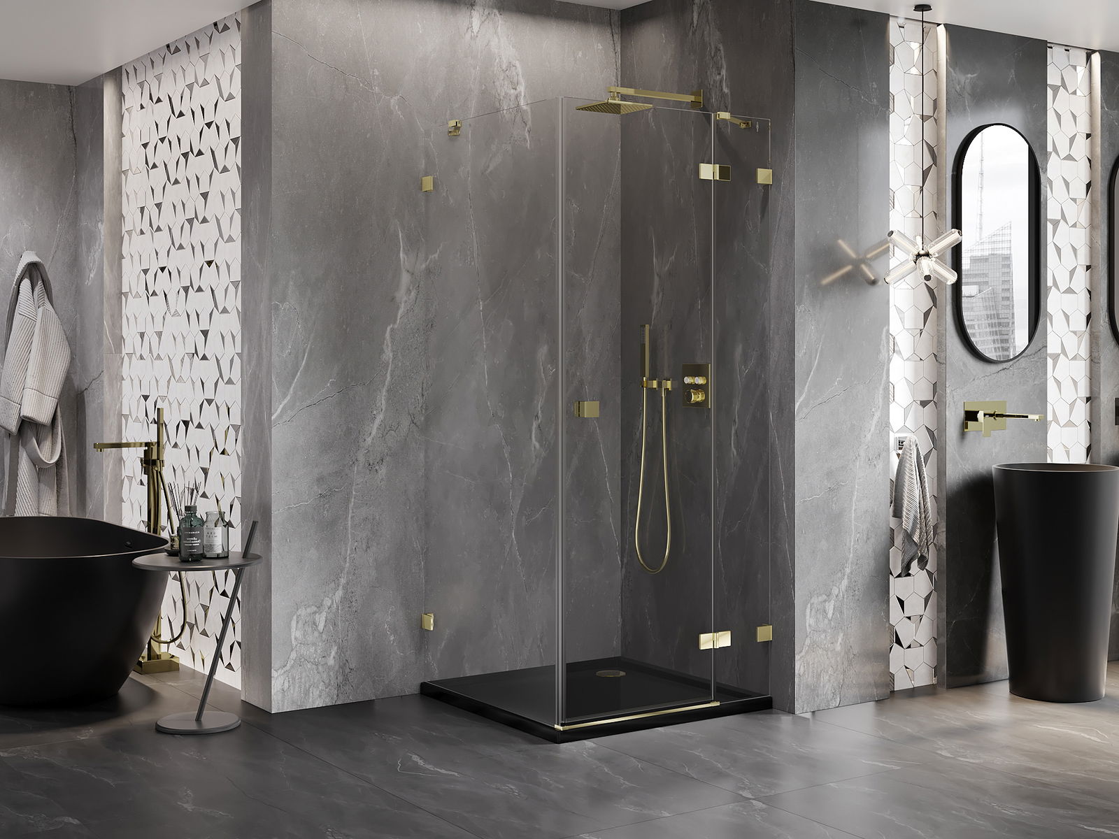 Skavas un eņģes ir izgatavotas no ļoti izturīga misiņa un papildus veido vienā līmenī esošu stikla virsmu. Tas ir lieliska izvēle, kas apvieno eleganci, izturību un modernu dizainu. Šādi risinājumi paaugstina dušas estētiku un vienlaikus atvieglo tīrības uzturēšanu.