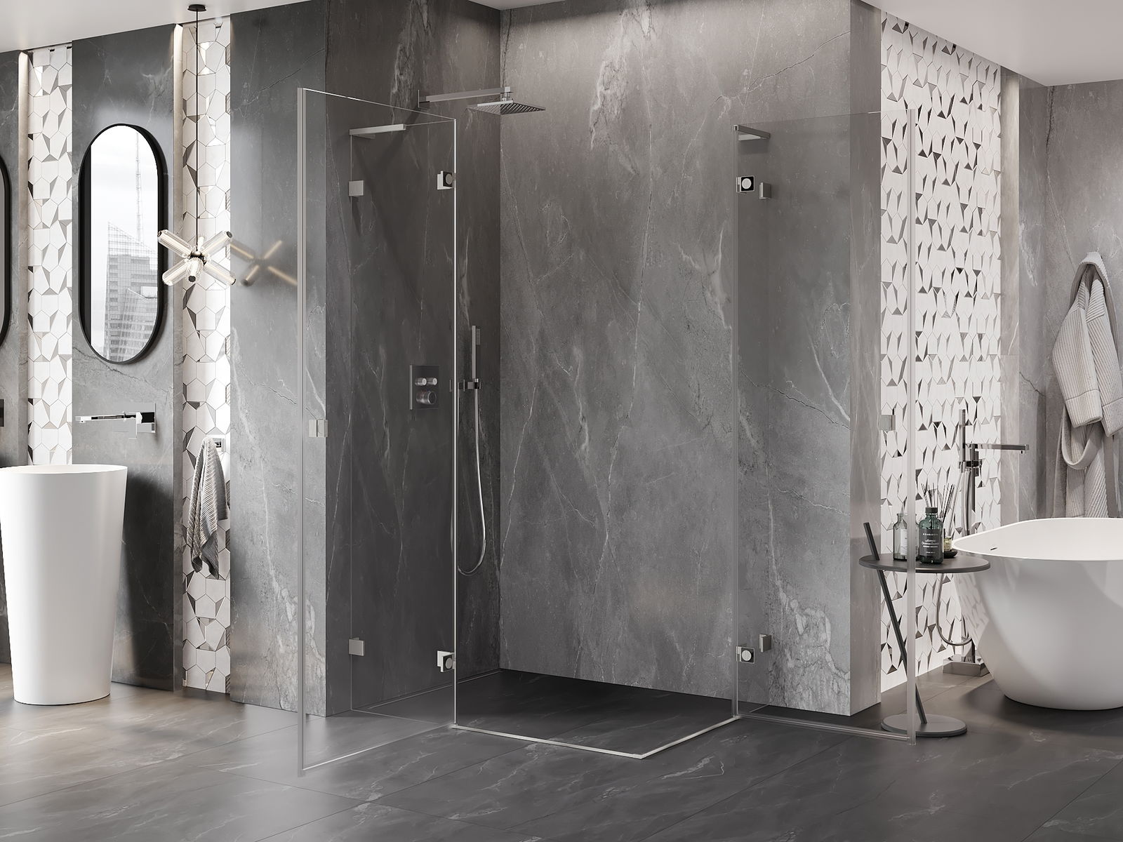 Skavas un eņģes ir izgatavotas no ļoti izturīga misiņa un papildus veido vienā līmenī esošu stikla virsmu. Tas ir lieliska izvēle, kas apvieno eleganci, izturību un modernu dizainu. Šādi risinājumi paaugstina dušas estētiku un vienlaikus atvieglo tīrības uzturēšanu.
