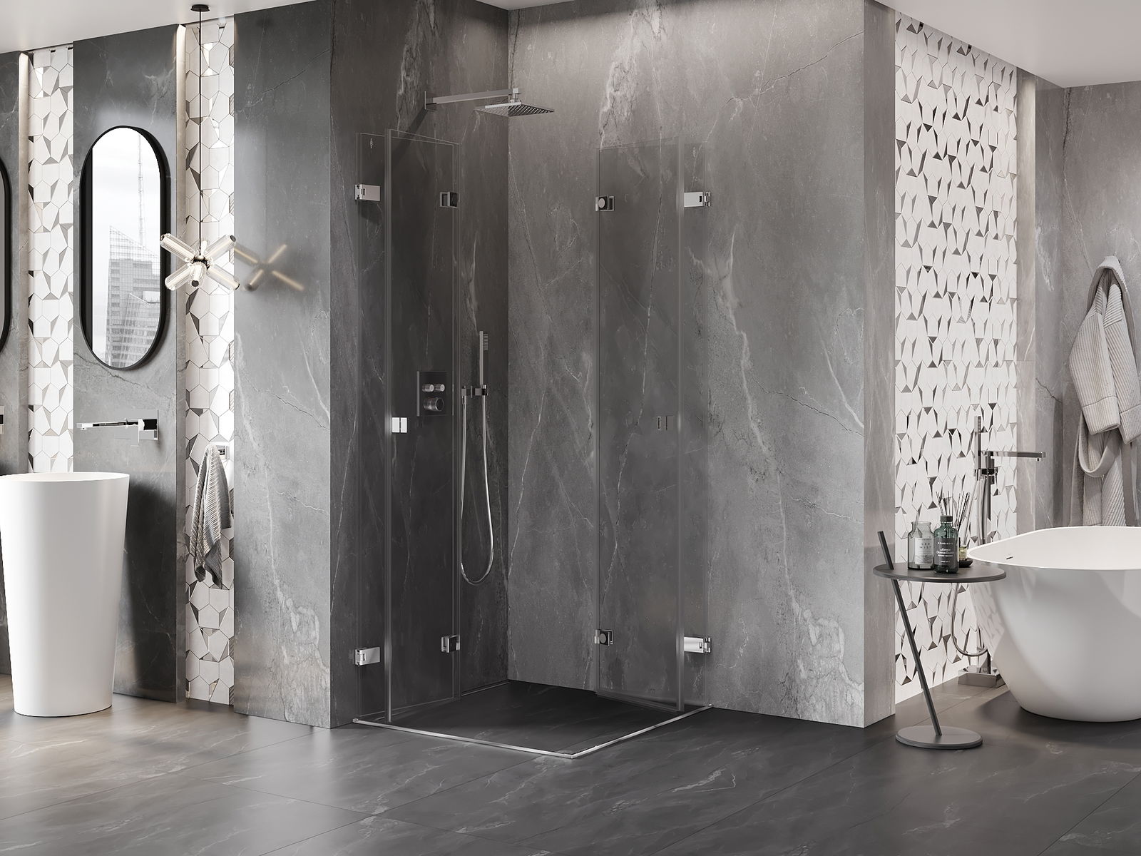 Iespēja salocīt durvis gan uz āru, gan uz iekšpusi, ļauj iegūt vairāk vietas, kad duša netiek izmantota. Tas ir ideāls risinājums mazākām vannas istabām, maksimāli izmantojot pieejamo telpu.