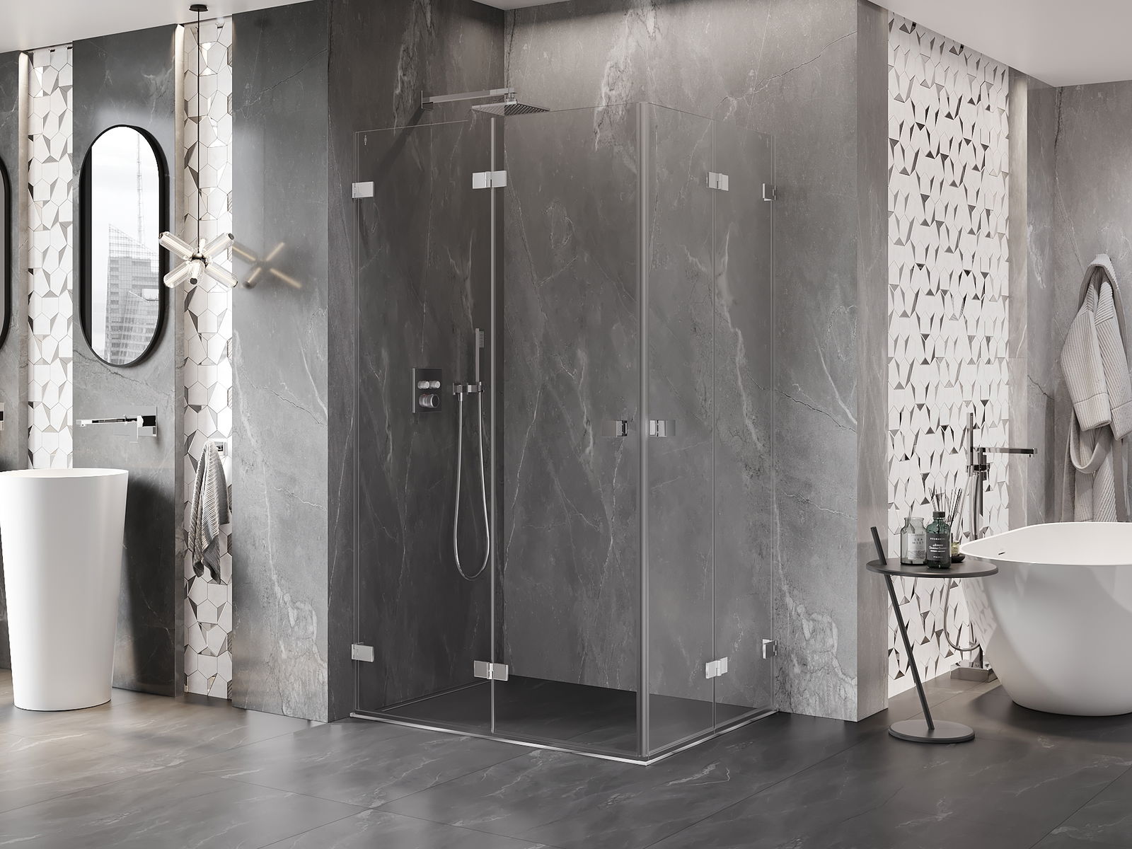 Iespēja salocīt durvis gan uz āru, gan uz iekšpusi, ļauj iegūt vairāk vietas, kad duša netiek izmantota. Tas ir ideāls risinājums mazākām vannas istabām, maksimāli izmantojot pieejamo telpu.