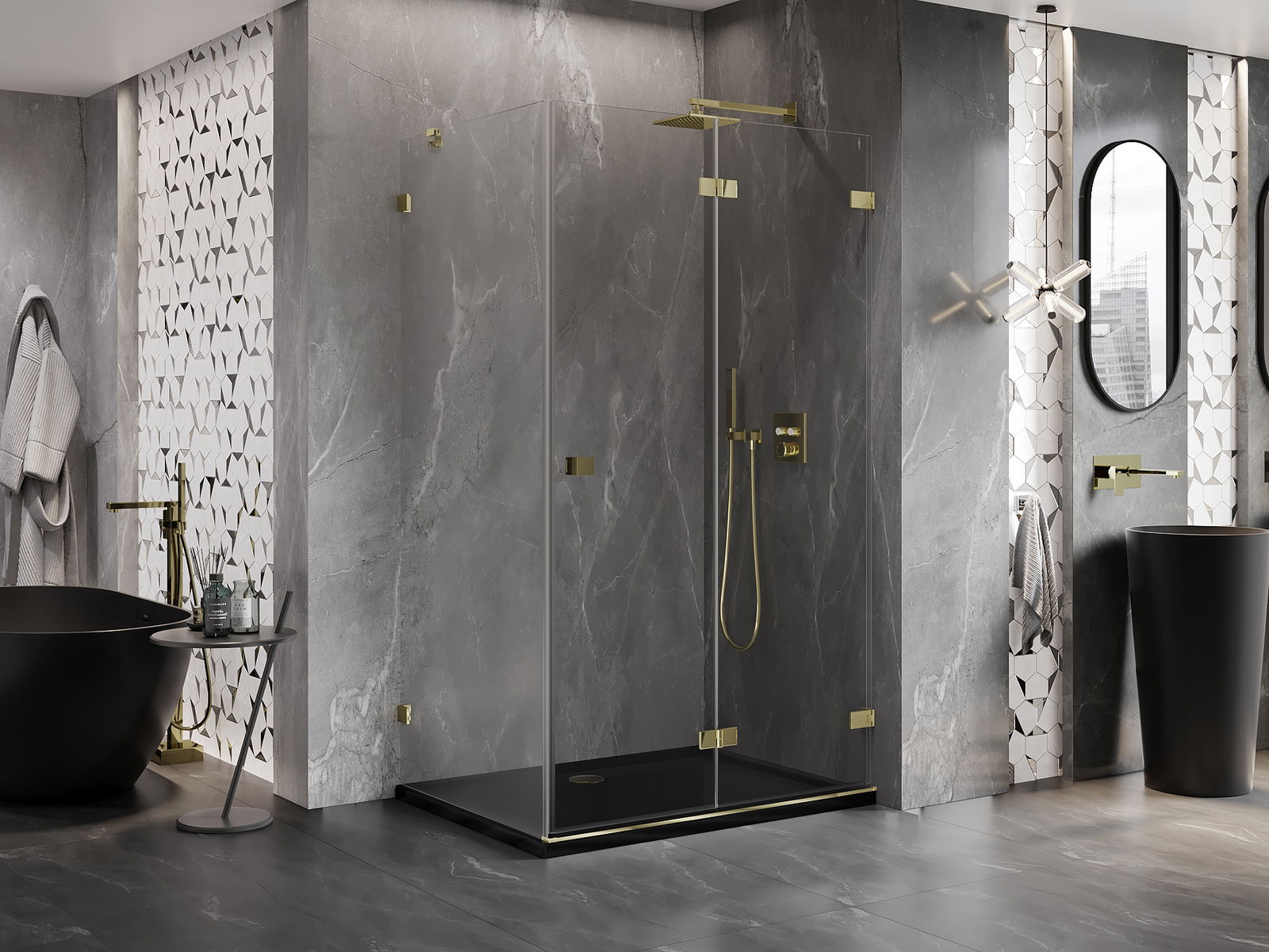 Skavas un eņģes ir izgatavotas no ļoti izturīga misiņa un papildus veido vienā līmenī esošu stikla virsmu. Tas ir lieliska izvēle, kas apvieno eleganci, izturību un modernu dizainu. Šādi risinājumi paaugstina dušas estētiku un vienlaikus atvieglo tīrības uzturēšanu.