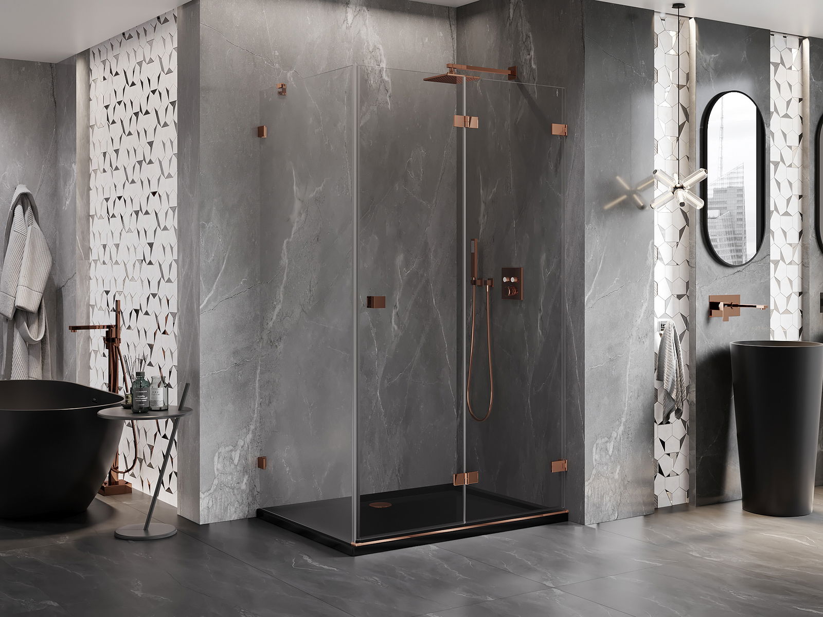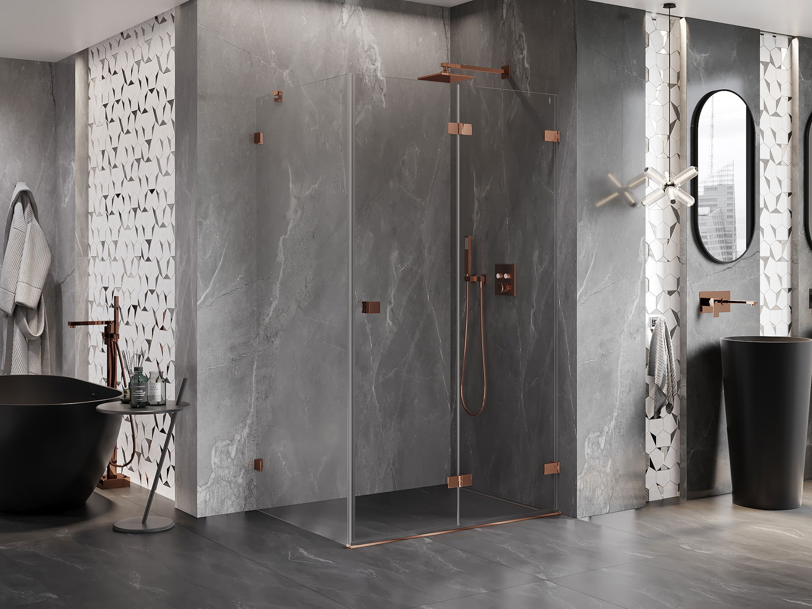 Skavas un eņģes ir izgatavotas no ļoti izturīga misiņa un papildus veido vienā līmenī esošu stikla virsmu. Tas ir lieliska izvēle, kas apvieno eleganci, izturību un modernu dizainu. Šādi risinājumi paaugstina dušas estētiku un vienlaikus atvieglo tīrības uzturēšanu.