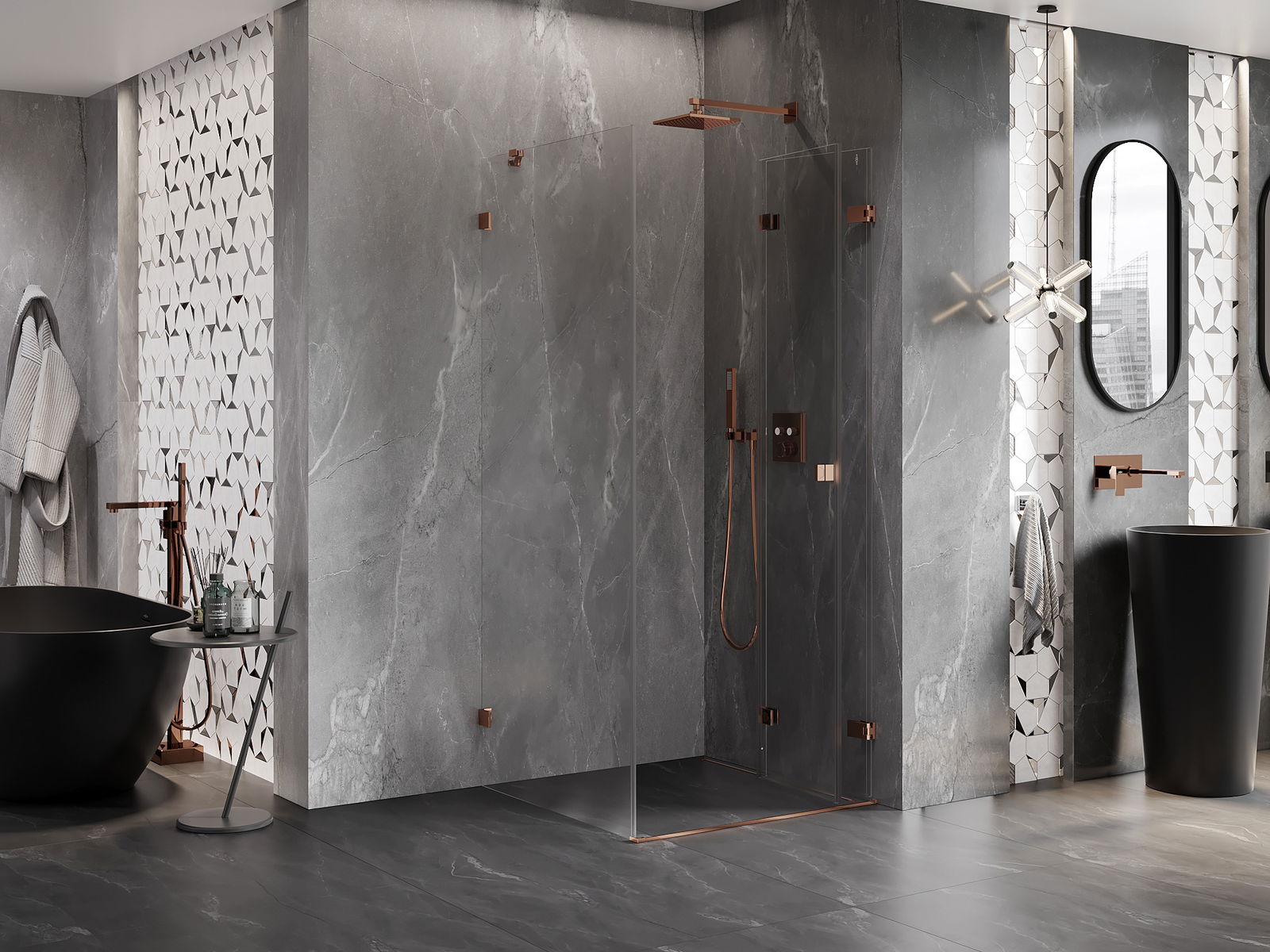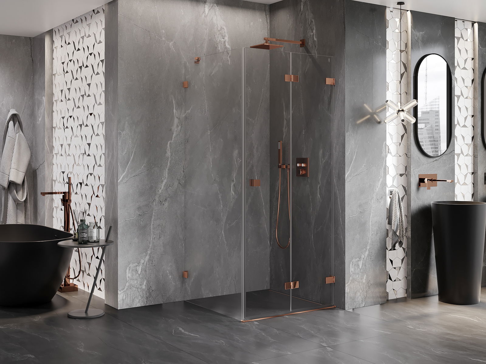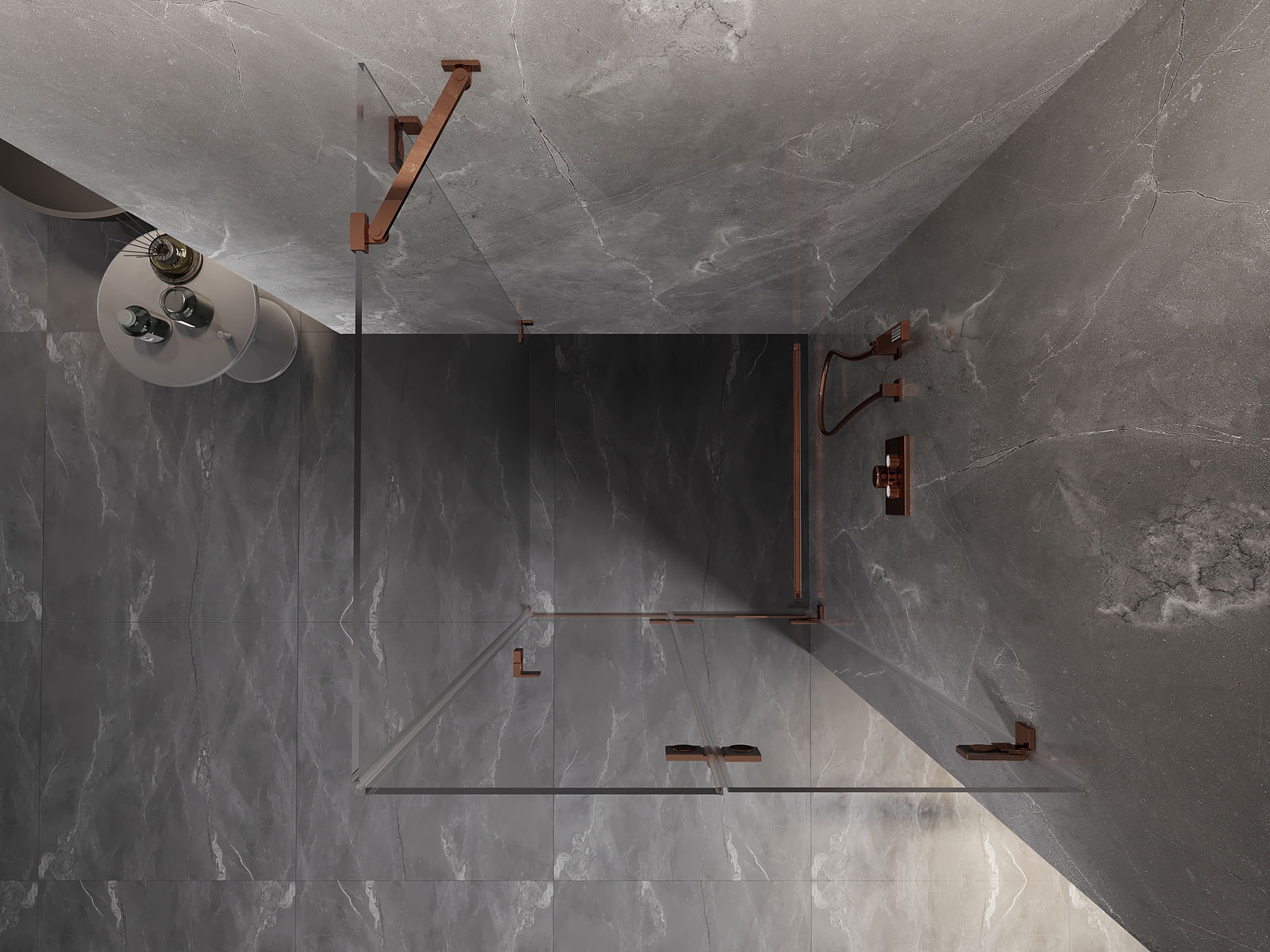 Skavas un eņģes ir izgatavotas no ļoti izturīga misiņa un papildus veido vienā līmenī esošu stikla virsmu. Tas ir lieliska izvēle, kas apvieno eleganci, izturību un modernu dizainu. Šādi risinājumi paaugstina dušas estētiku un vienlaikus atvieglo tīrības uzturēšanu.
