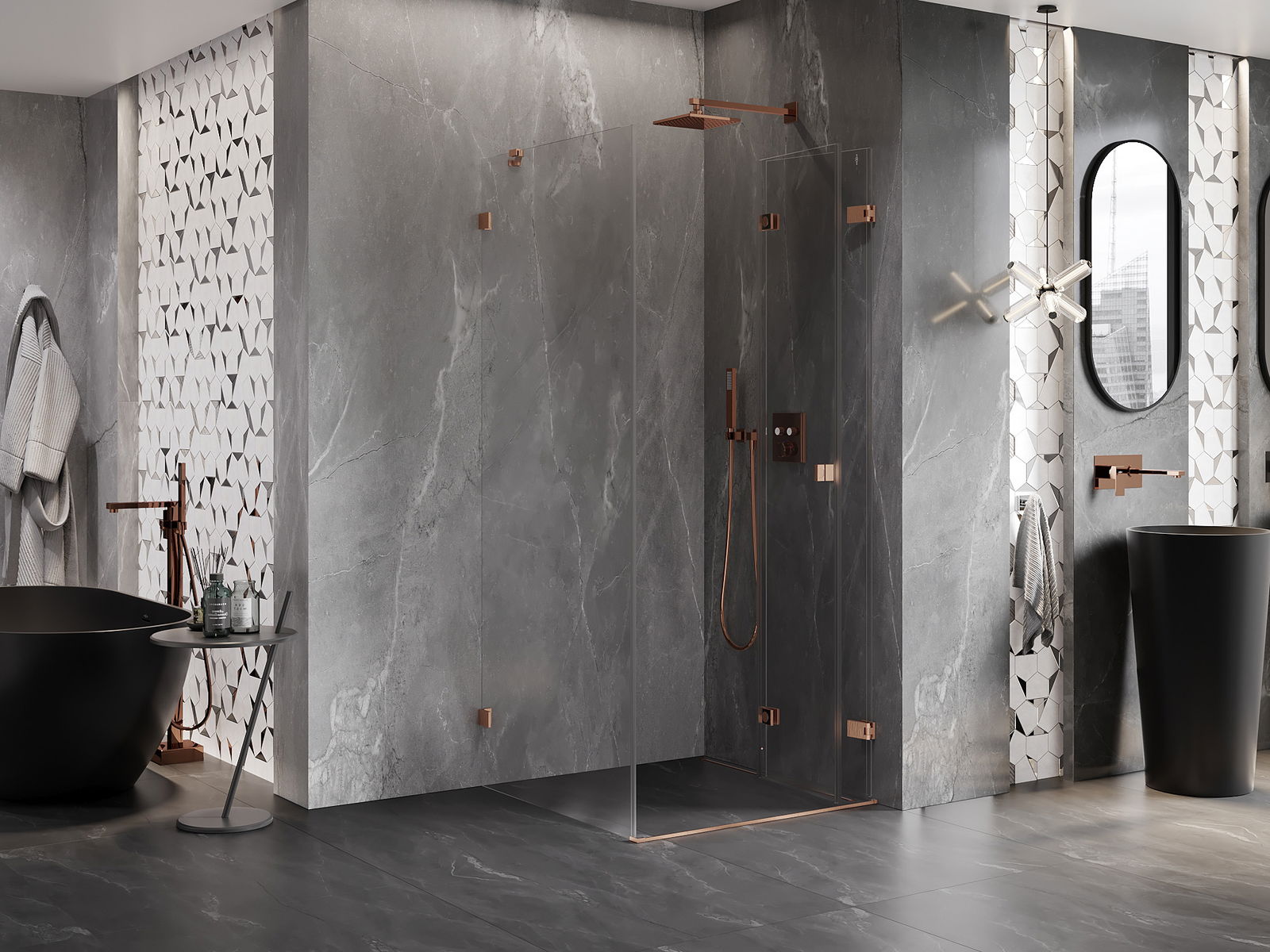 Skavas un eņģes ir izgatavotas no ļoti izturīga misiņa un papildus veido vienā līmenī esošu stikla virsmu. Tas ir lieliska izvēle, kas apvieno eleganci, izturību un modernu dizainu. Šādi risinājumi paaugstina dušas estētiku un vienlaikus atvieglo tīrības uzturēšanu.