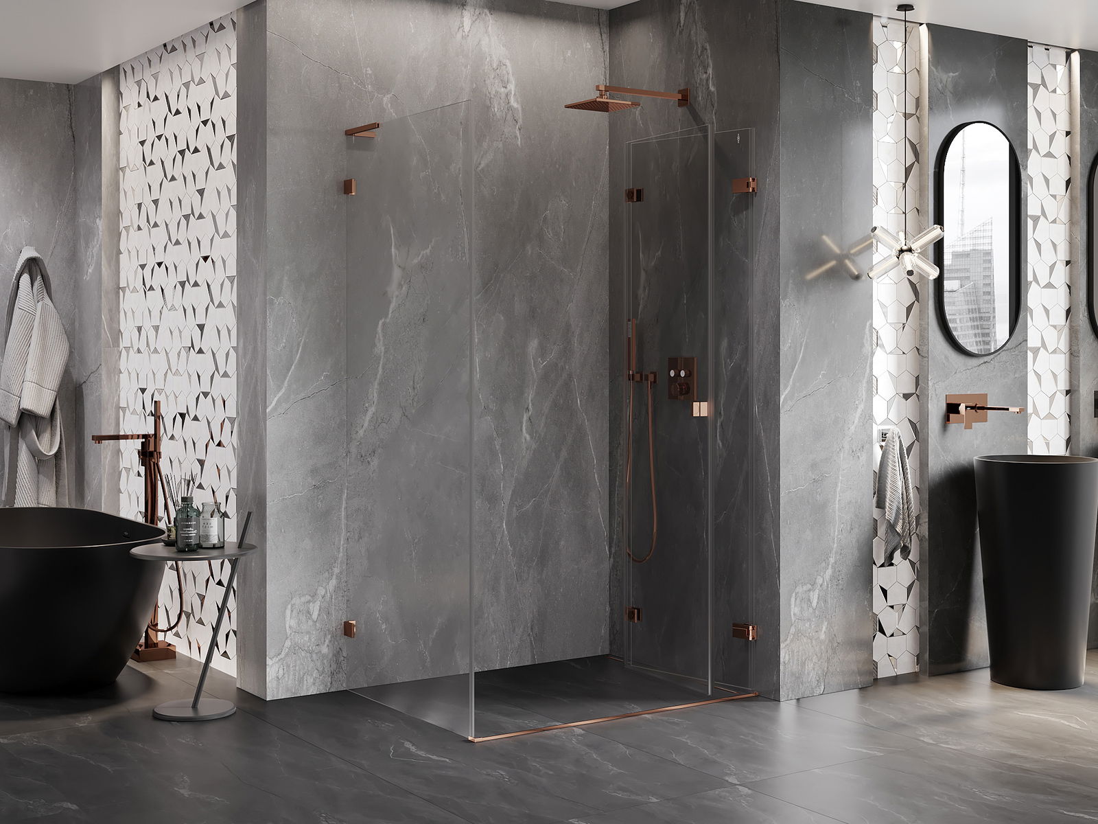 Skavas un eņģes ir izgatavotas no ļoti izturīga misiņa un papildus veido vienā līmenī esošu stikla virsmu. Tas ir lieliska izvēle, kas apvieno eleganci, izturību un modernu dizainu. Šādi risinājumi paaugstina dušas estētiku un vienlaikus atvieglo tīrības uzturēšanu.