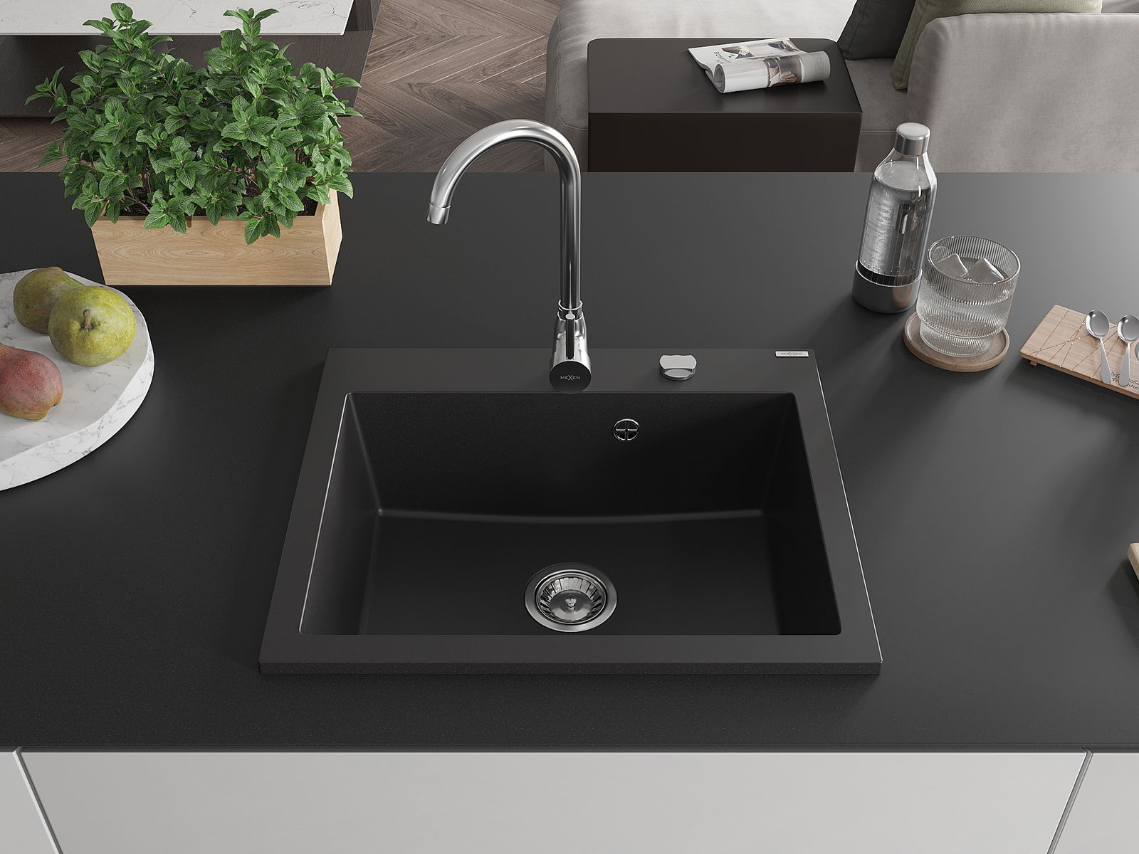 Izlietnei ir padziļināts caurums ar diametru 35 mm, kuru varat izsist patstāvīgi. To var izmantot, piemēram, šķidruma dozatora uzstādīšanai, kas novērsīs plastmasas pudeļu klātbūtni virtuvē un piešķirs tai elegantu apdari.