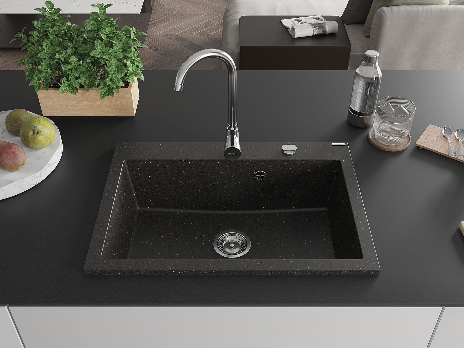 Mexen Elix granīta izlietne ar vienu kameru 700 x 500 mm, melna/zeltaini metāliska, hroma sifons - 6526701005-75