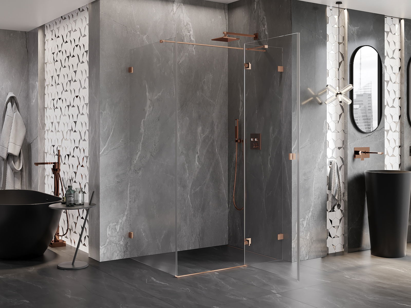 Skavas un eņģes ir izgatavotas no ļoti izturīga misiņa un papildus veido vienā līmenī esošu stikla virsmu. Tas ir lieliska izvēle, kas apvieno eleganci, izturību un modernu dizainu. Šādi risinājumi paaugstina dušas estētiku un vienlaikus atvieglo tīrības uzturēšanu.
