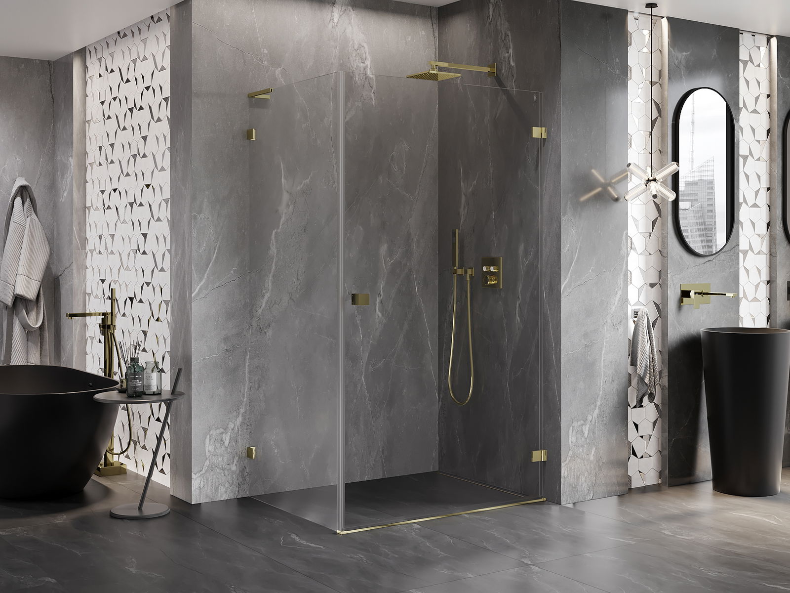 Stiprinājumi ir izgatavoti no ļoti izturīga misiņa, un tie veido ar stikla virsmu vienmērīgu plāksni. Tas ir lieliska izvēle, kas apvieno eleganci, izturību un modernu dizainu. Pateicoties šādiem risinājumiem, duša iegūst estētiku un tajā pašā laikā atvieglo tīrības uzturēšanu.