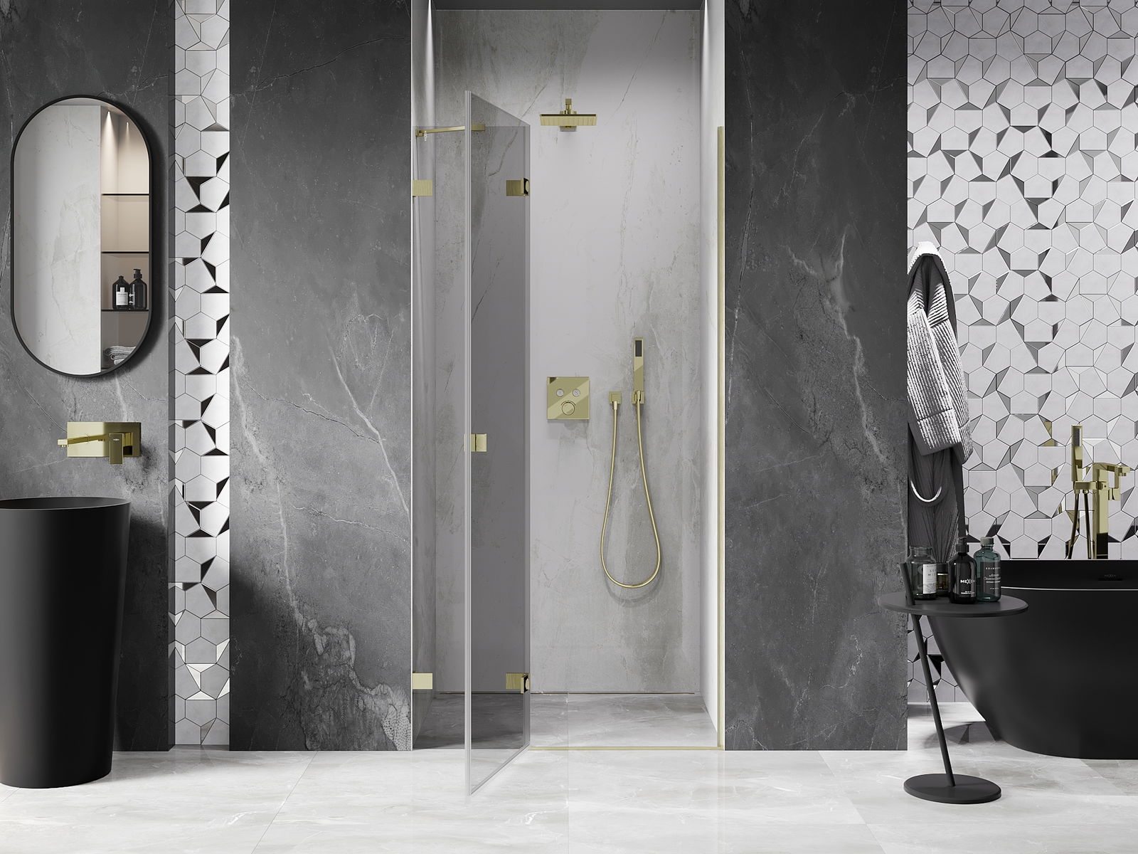 Skavas un eņģes ir izgatavotas no ļoti izturīga misiņa un papildus veido vienā līmenī esošu stikla virsmu. Tas ir lieliska izvēle, kas apvieno eleganci, izturību un modernu dizainu. Šādi risinājumi paaugstina dušas estētiku un vienlaikus atvieglo tīrības uzturēšanu.