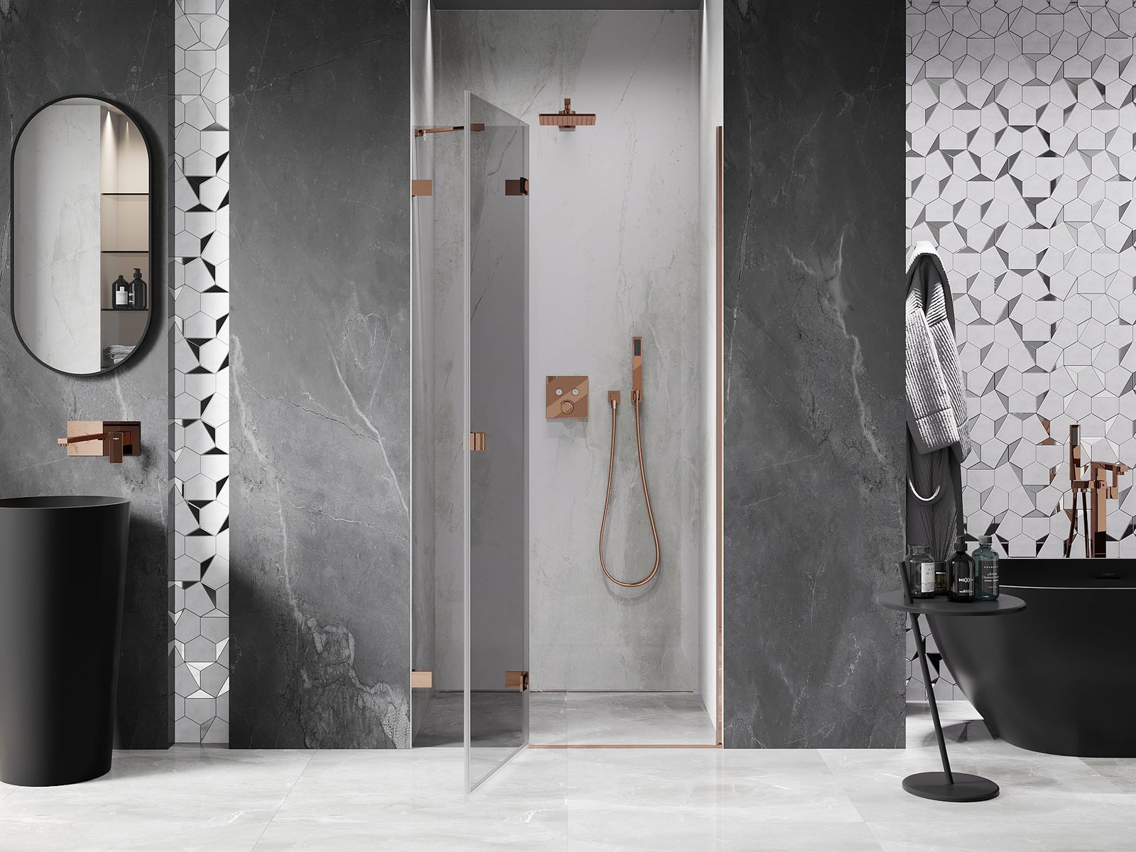 Skavas un eņģes ir izgatavotas no ļoti izturīga misiņa un papildus veido vienā līmenī esošu stikla virsmu. Tas ir lieliska izvēle, kas apvieno eleganci, izturību un modernu dizainu. Šādi risinājumi paaugstina dušas estētiku un vienlaikus atvieglo tīrības uzturēšanu.