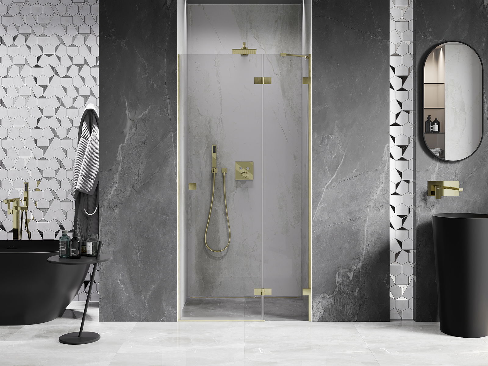 Skavas un eņģes ir izgatavotas no ļoti izturīga misiņa un papildus veido vienā līmenī esošu stikla virsmu. Tas ir lieliska izvēle, kas apvieno eleganci, izturību un modernu dizainu. Šādi risinājumi paaugstina dušas estētiku un vienlaikus atvieglo tīrības uzturēšanu.