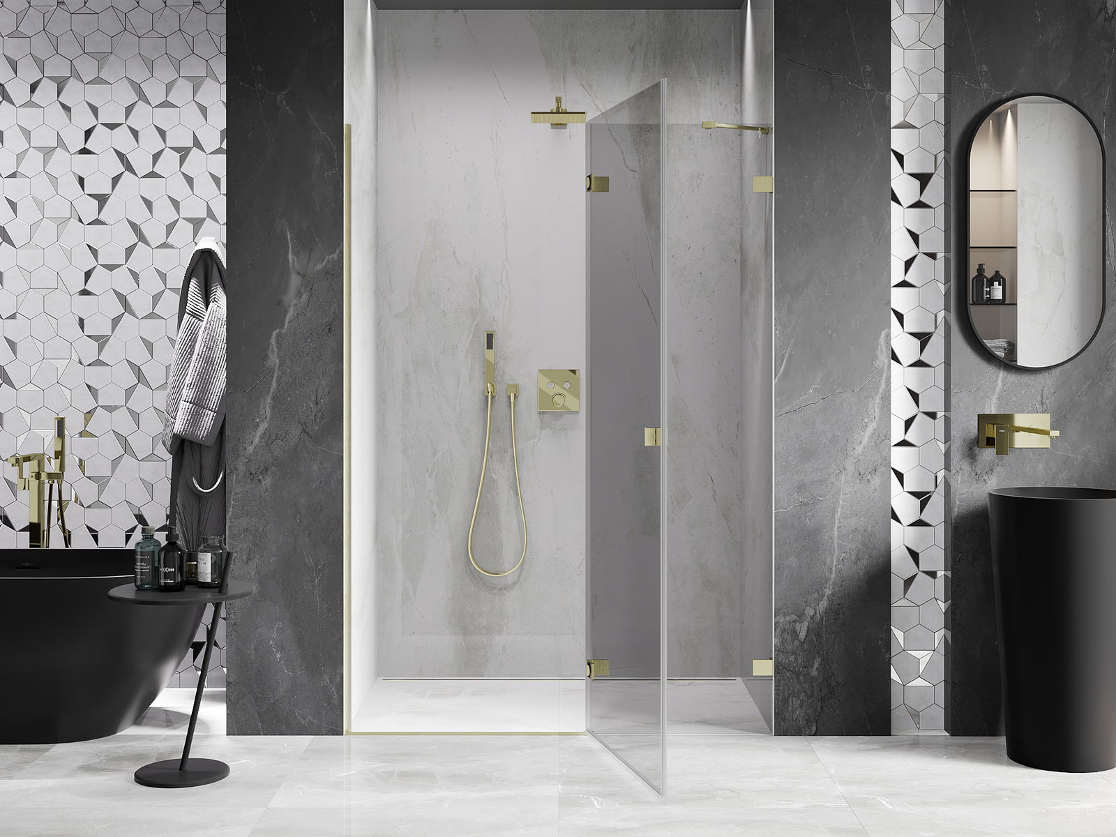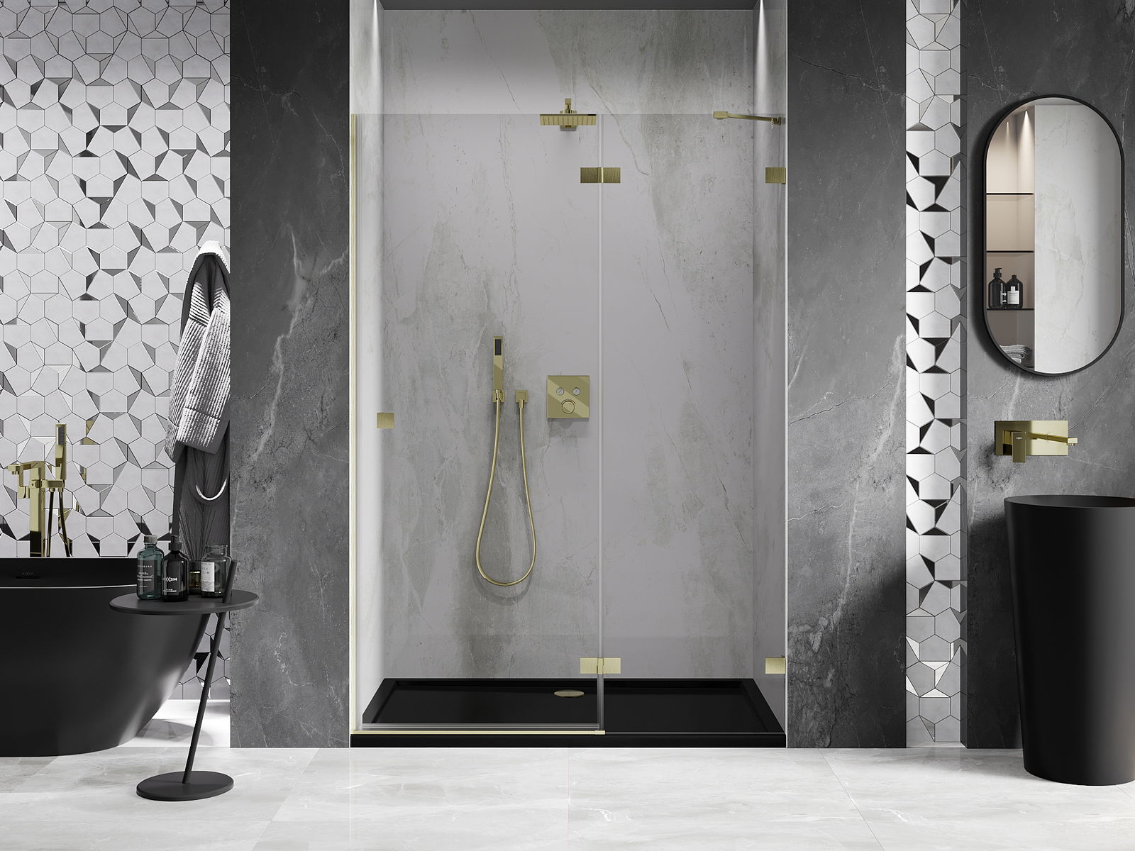 Skavas un eņģes ir izgatavotas no ļoti izturīga misiņa un papildus veido vienā līmenī esošu stikla virsmu. Tas ir lieliska izvēle, kas apvieno eleganci, izturību un modernu dizainu. Šādi risinājumi paaugstina dušas estētiku un vienlaikus atvieglo tīrības uzturēšanu.