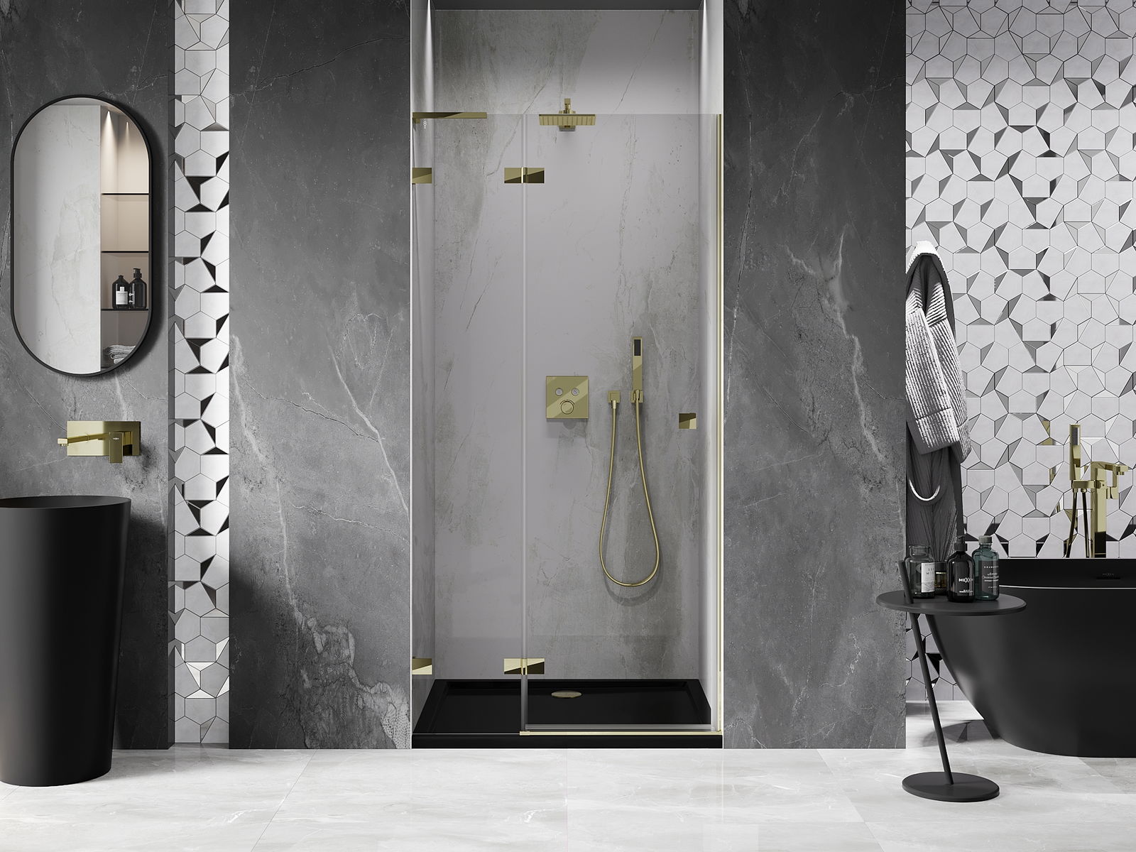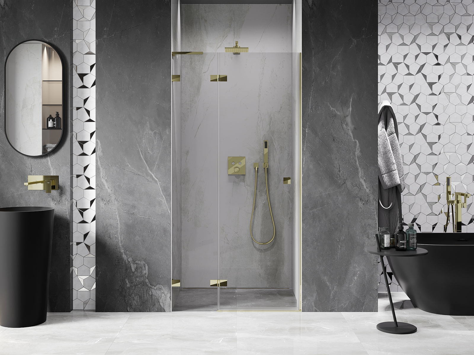 Skavas un eņģes ir izgatavotas no ļoti izturīga misiņa un papildus veido vienā līmenī esošu stikla virsmu. Tas ir lieliska izvēle, kas apvieno eleganci, izturību un modernu dizainu. Šādi risinājumi paaugstina dušas estētiku un vienlaikus atvieglo tīrības uzturēšanu.