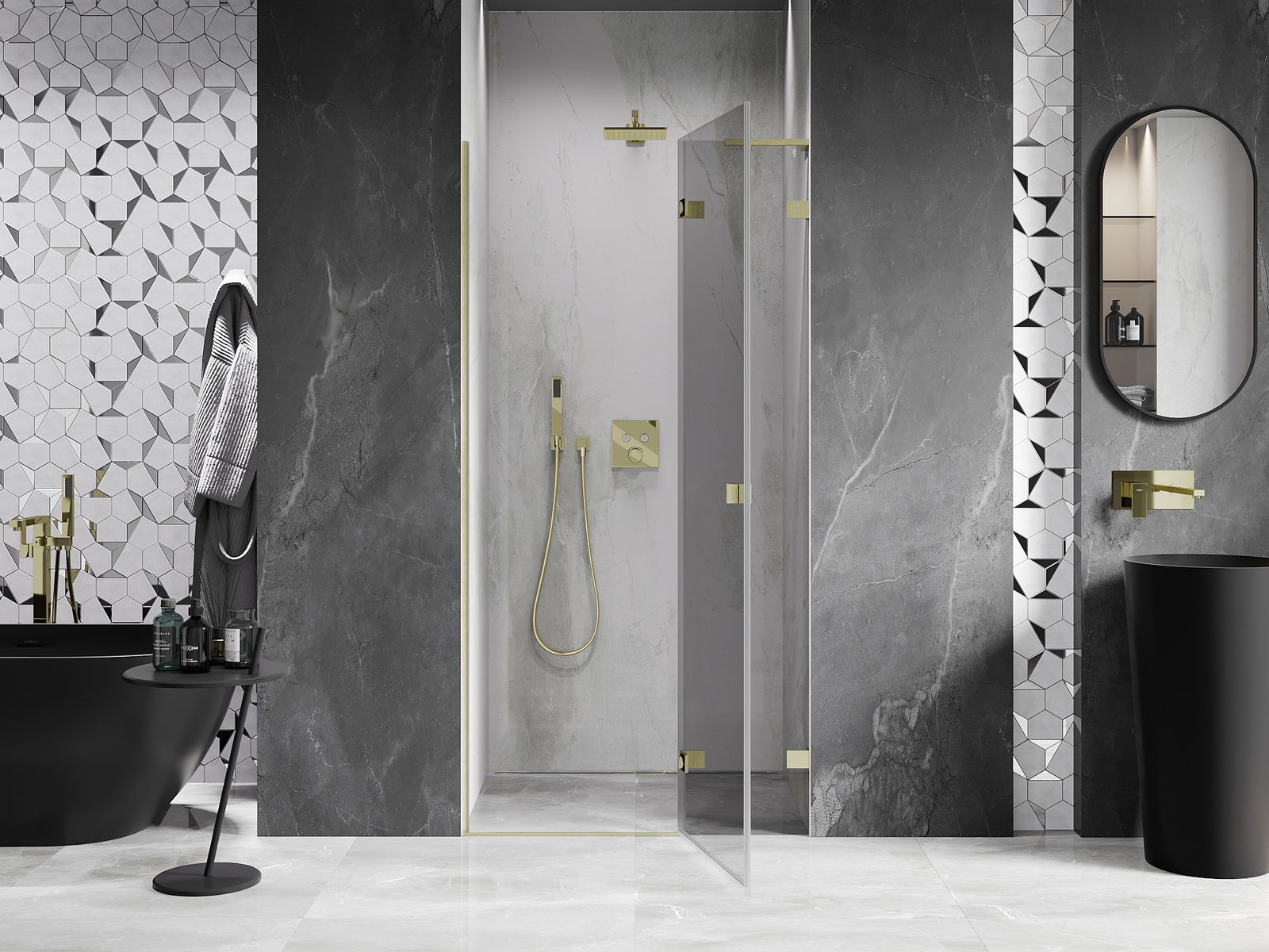 Skavas un eņģes ir izgatavotas no ļoti izturīga misiņa un papildus veido vienā līmenī esošu stikla virsmu. Tas ir lieliska izvēle, kas apvieno eleganci, izturību un modernu dizainu. Šādi risinājumi paaugstina dušas estētiku un vienlaikus atvieglo tīrības uzturēšanu.