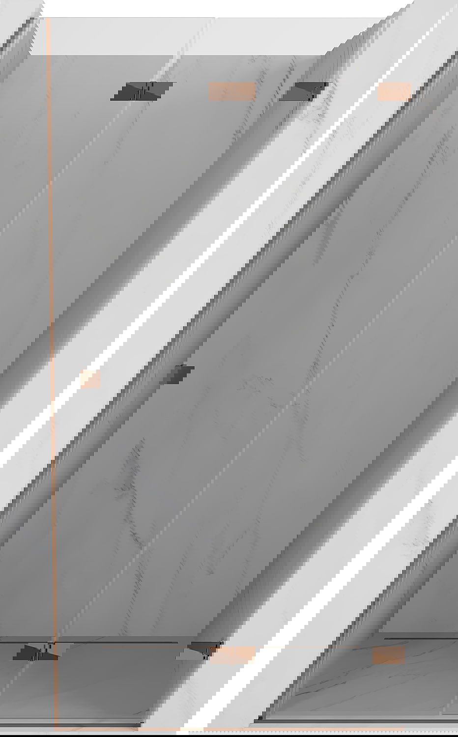 Skavas un eņģes ir izgatavotas no ļoti izturīga misiņa un papildus veido vienā līmenī esošu stikla virsmu. Tas ir lieliska izvēle, kas apvieno eleganci, izturību un modernu dizainu. Šādi risinājumi paaugstina dušas estētiku un vienlaikus atvieglo tīrības uzturēšanu.