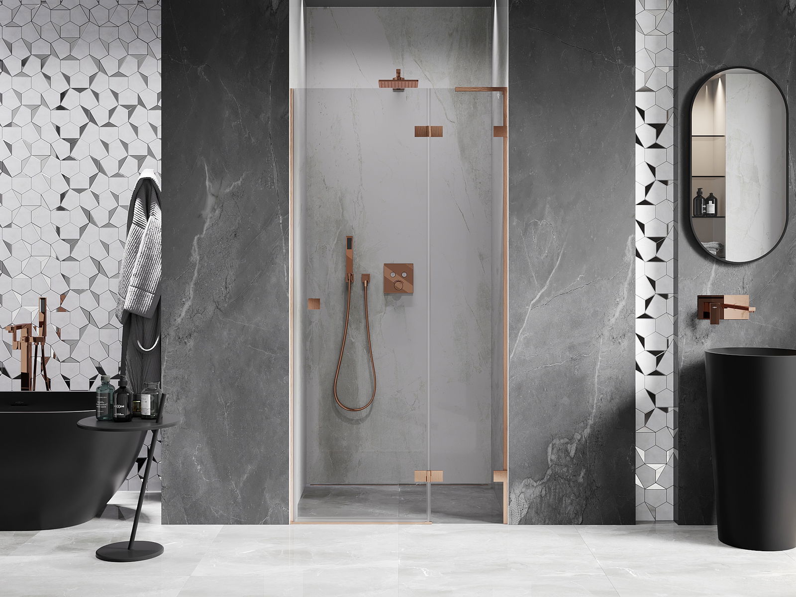 Mexen Lunar L labajā pusē veramās dušas durvis 115 cm, caurspīdīgas, matēta vara apdare - 834L-115-000-65-00-P