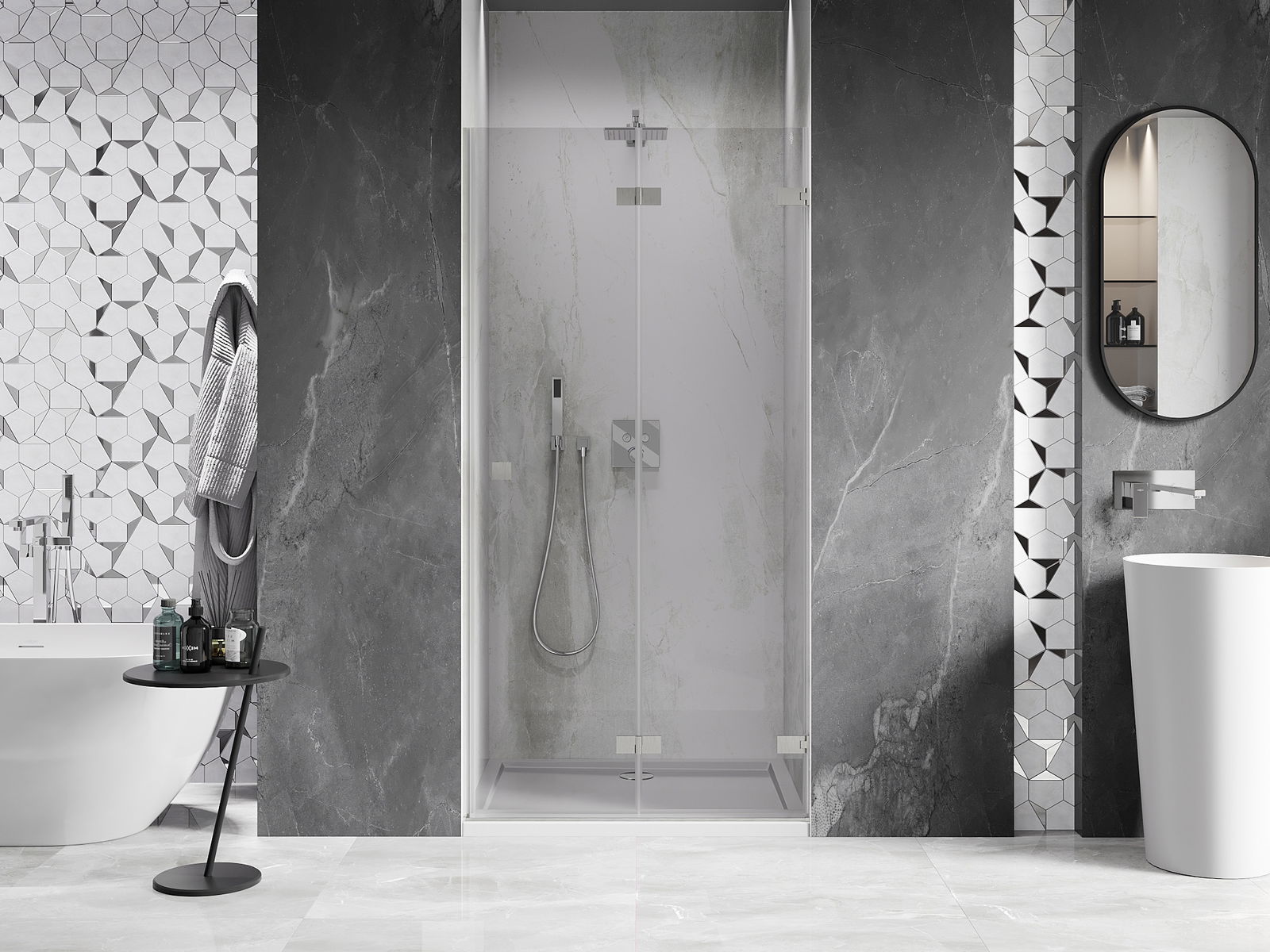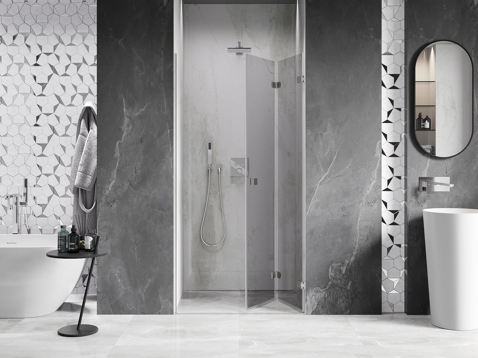 Iespēja salocīt durvis gan uz āru, gan uz iekšpusi, ļauj iegūt vairāk vietas, kad duša netiek izmantota. Tas ir ideāls risinājums mazākām vannas istabām, maksimāli izmantojot pieejamo telpu.