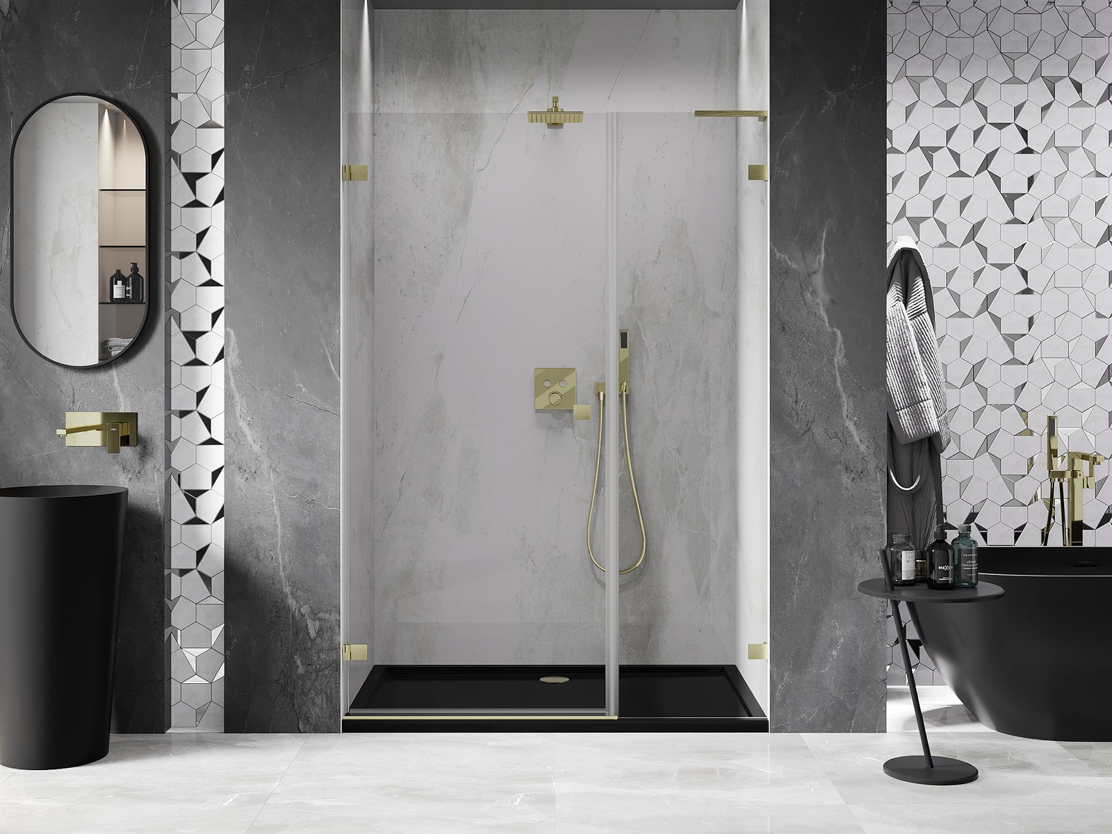 Stiprinājumi ir izgatavoti no ļoti izturīga misiņa, un tie veido ar stikla virsmu vienmērīgu plāksni. Tas ir lieliska izvēle, kas apvieno eleganci, izturību un modernu dizainu. Pateicoties šādiem risinājumiem, duša iegūst estētiku un tajā pašā laikā atvieglo tīrības uzturēšanu.