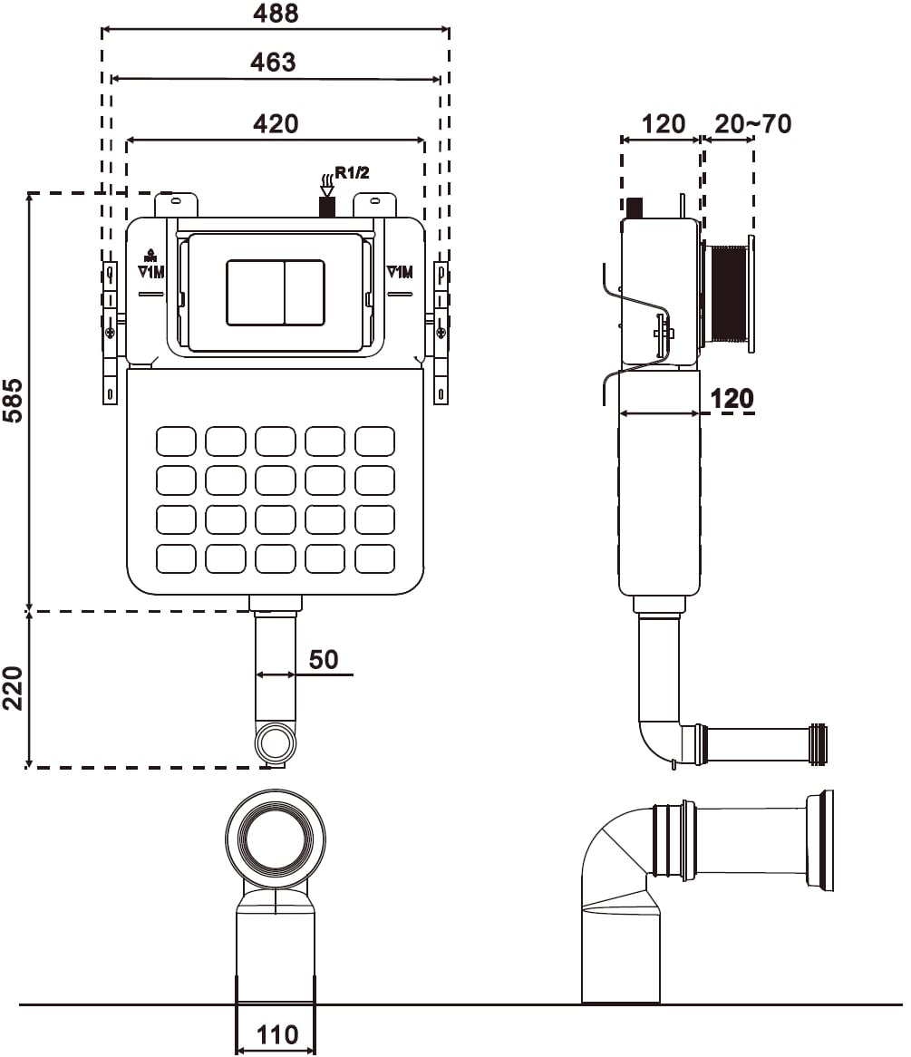 Produktam ir regulējams notekcauruļu ceļgals, kas ļauj samazināt montāžas dziļumu. Šī funkcija ļauj viegli pielāgot produktu dažādiem vannas istabā pieejamiem notekcaurulēm, nodrošinot precīzu montāžu.