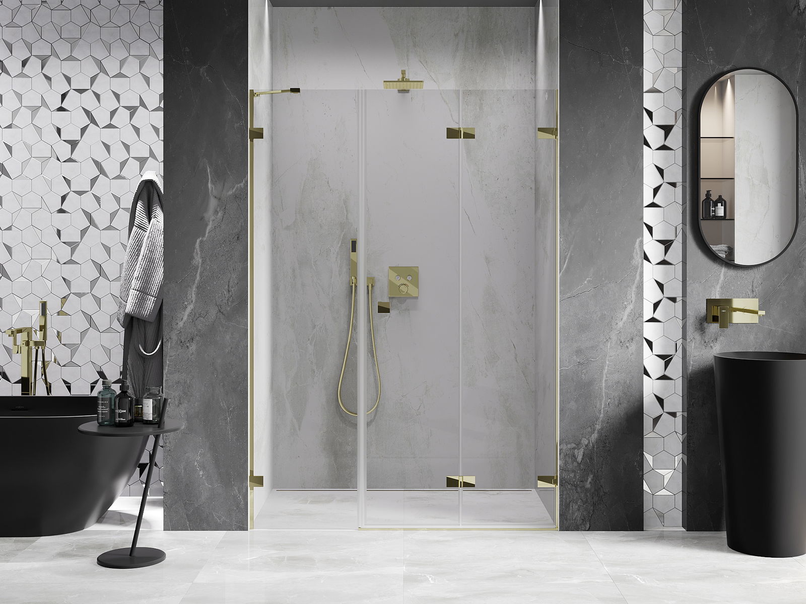 Skavas un eņģes ir izgatavotas no ļoti izturīga misiņa un papildus veido vienā līmenī esošu stikla virsmu. Tas ir lieliska izvēle, kas apvieno eleganci, izturību un modernu dizainu. Šādi risinājumi paaugstina dušas estētiku un vienlaikus atvieglo tīrības uzturēšanu.