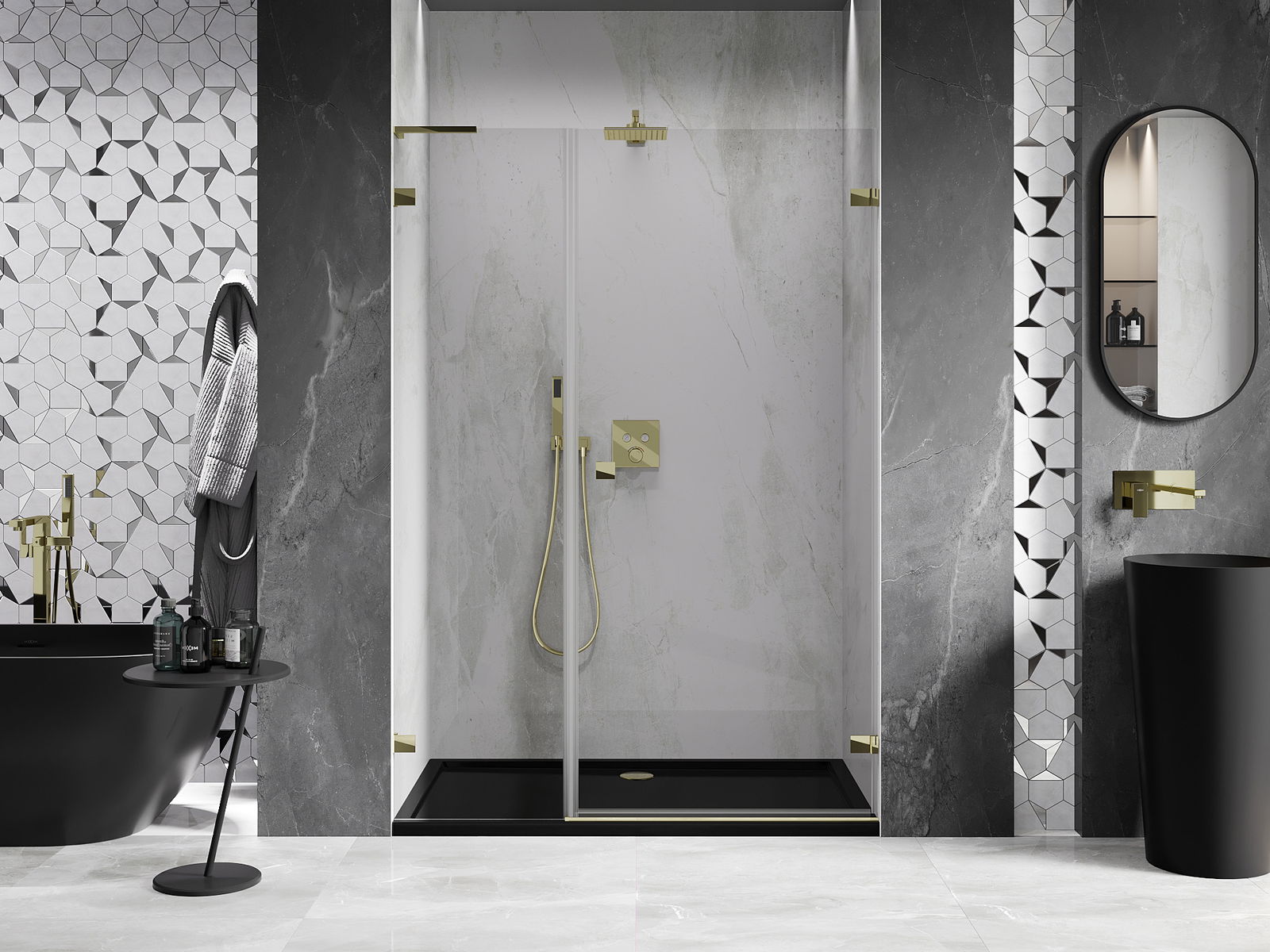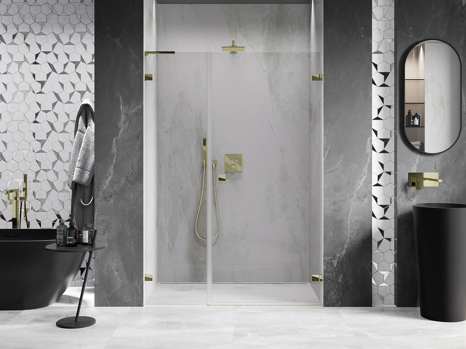 Stiprinājumi ir izgatavoti no ļoti izturīga misiņa, un tie veido ar stikla virsmu vienmērīgu plāksni. Tas ir lieliska izvēle, kas apvieno eleganci, izturību un modernu dizainu. Pateicoties šādiem risinājumiem, duša iegūst estētiku un tajā pašā laikā atvieglo tīrības uzturēšanu.