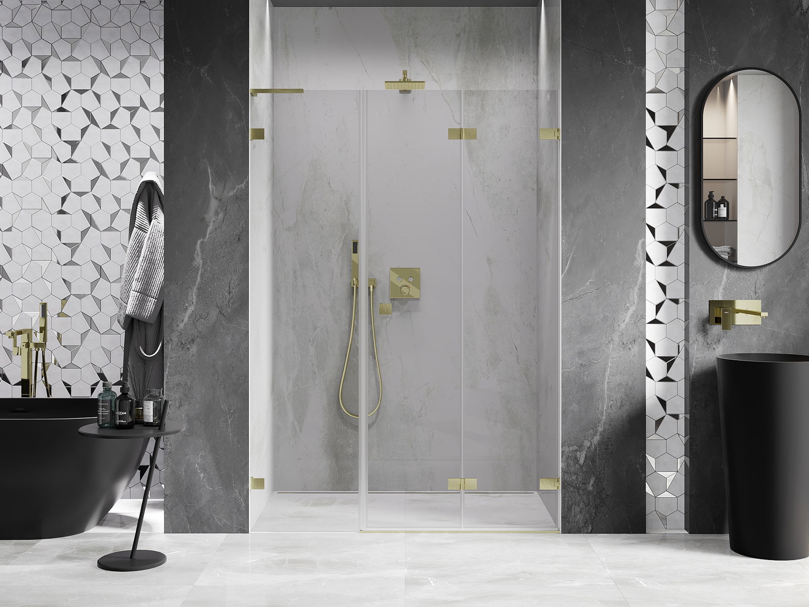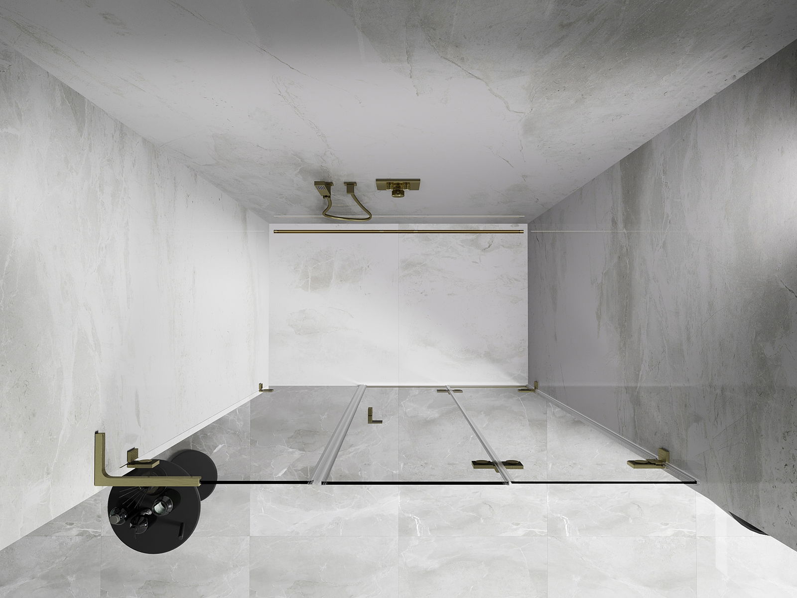 Skavas un eņģes ir izgatavotas no ļoti izturīga misiņa un papildus veido vienā līmenī esošu stikla virsmu. Tas ir lieliska izvēle, kas apvieno eleganci, izturību un modernu dizainu. Šādi risinājumi paaugstina dušas estētiku un vienlaikus atvieglo tīrības uzturēšanu.