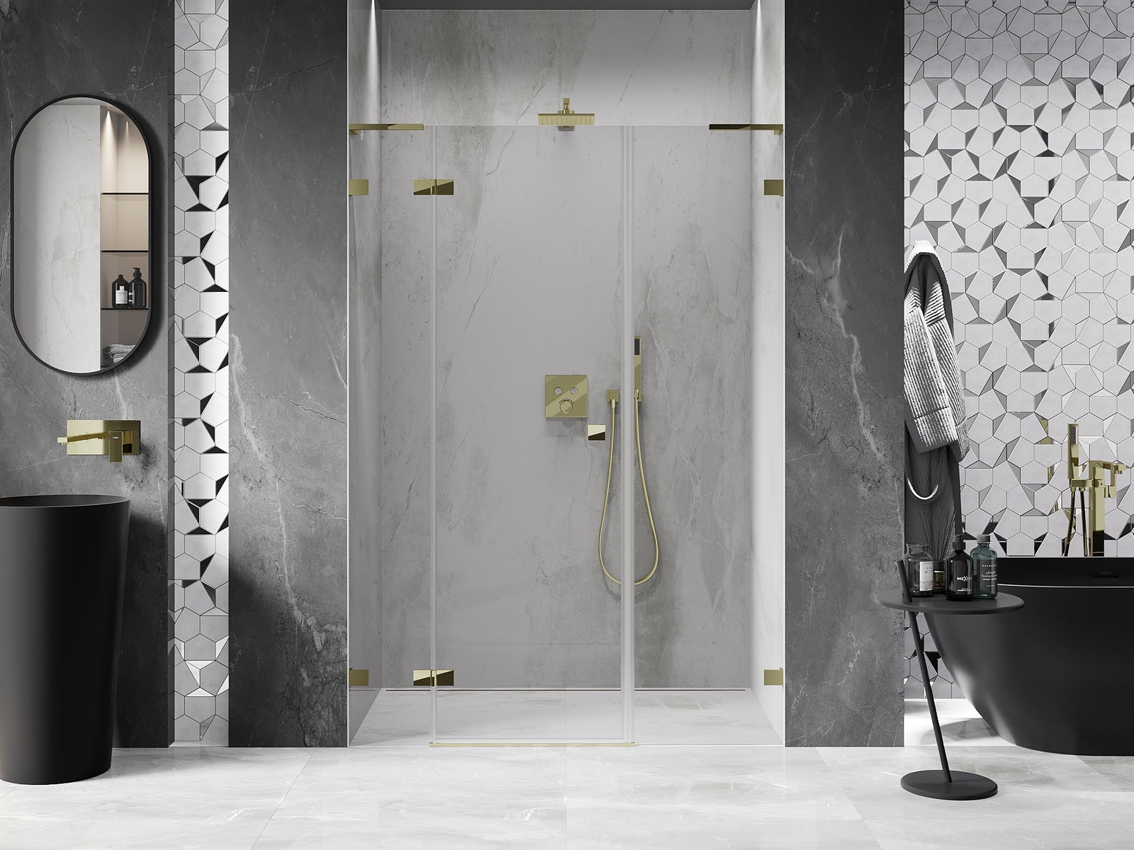 Skavas un eņģes ir izgatavotas no ļoti izturīga misiņa un papildus veido vienā līmenī esošu stikla virsmu. Tas ir lieliska izvēle, kas apvieno eleganci, izturību un modernu dizainu. Šādi risinājumi paaugstina dušas estētiku un vienlaikus atvieglo tīrības uzturēšanu.