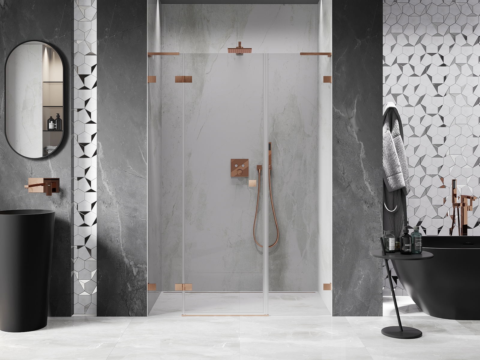 Skavas un eņģes ir izgatavotas no ļoti izturīga misiņa un papildus veido vienā līmenī esošu stikla virsmu. Tas ir lieliska izvēle, kas apvieno eleganci, izturību un modernu dizainu. Šādi risinājumi paaugstina dušas estētiku un vienlaikus atvieglo tīrības uzturēšanu.