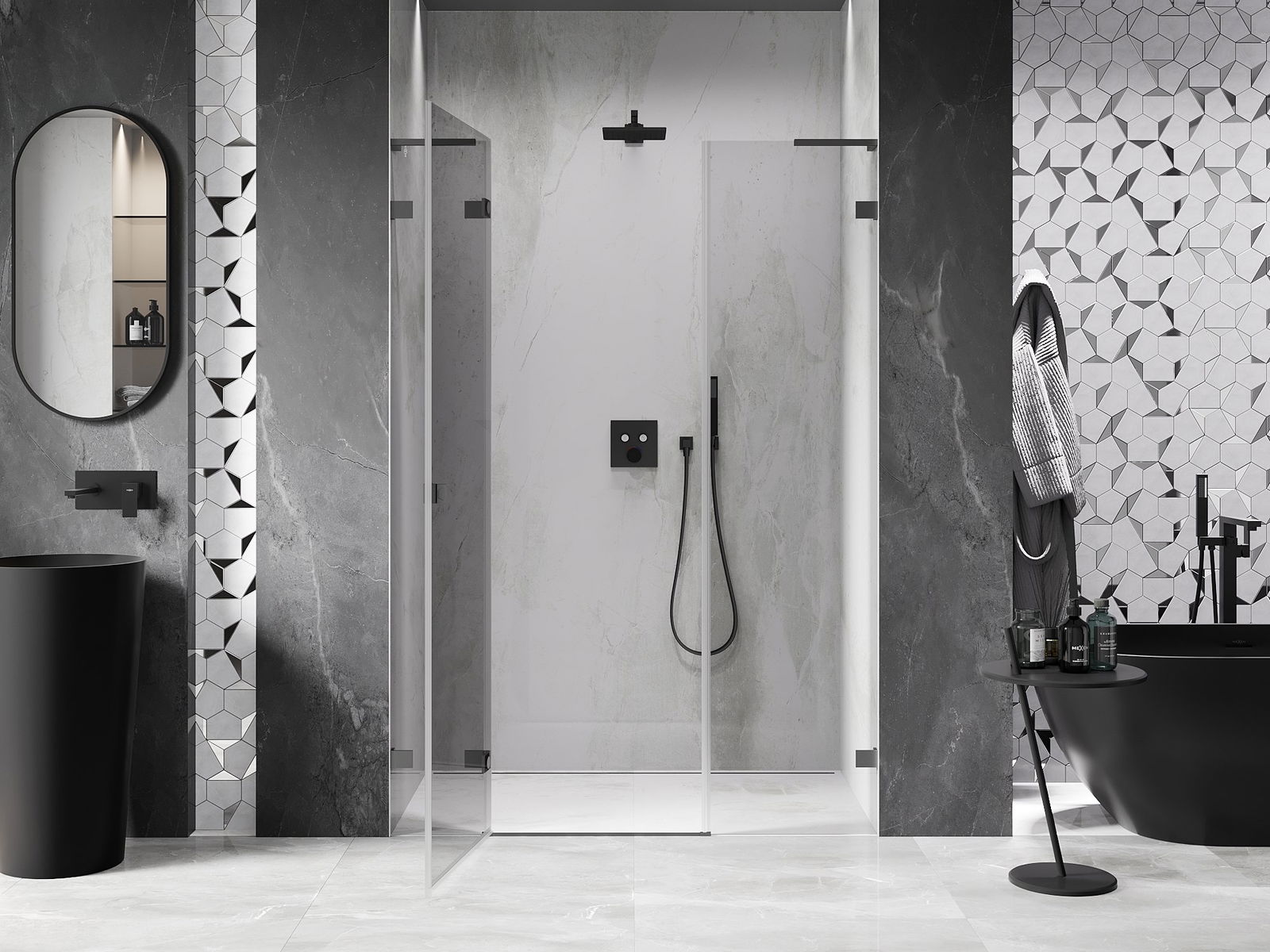 Skavas un eņģes ir izgatavotas no ļoti izturīga misiņa un papildus veido vienā līmenī esošu stikla virsmu. Tas ir lieliska izvēle, kas apvieno eleganci, izturību un modernu dizainu. Šādi risinājumi paaugstina dušas estētiku un vienlaikus atvieglo tīrības uzturēšanu.
