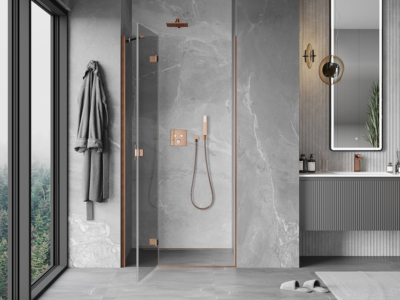 Mexen Mist-H kreisās veramās dušas durvis 120 cm, caurspīdīgs, matēts varš - 8A5-120-000-65-00-L