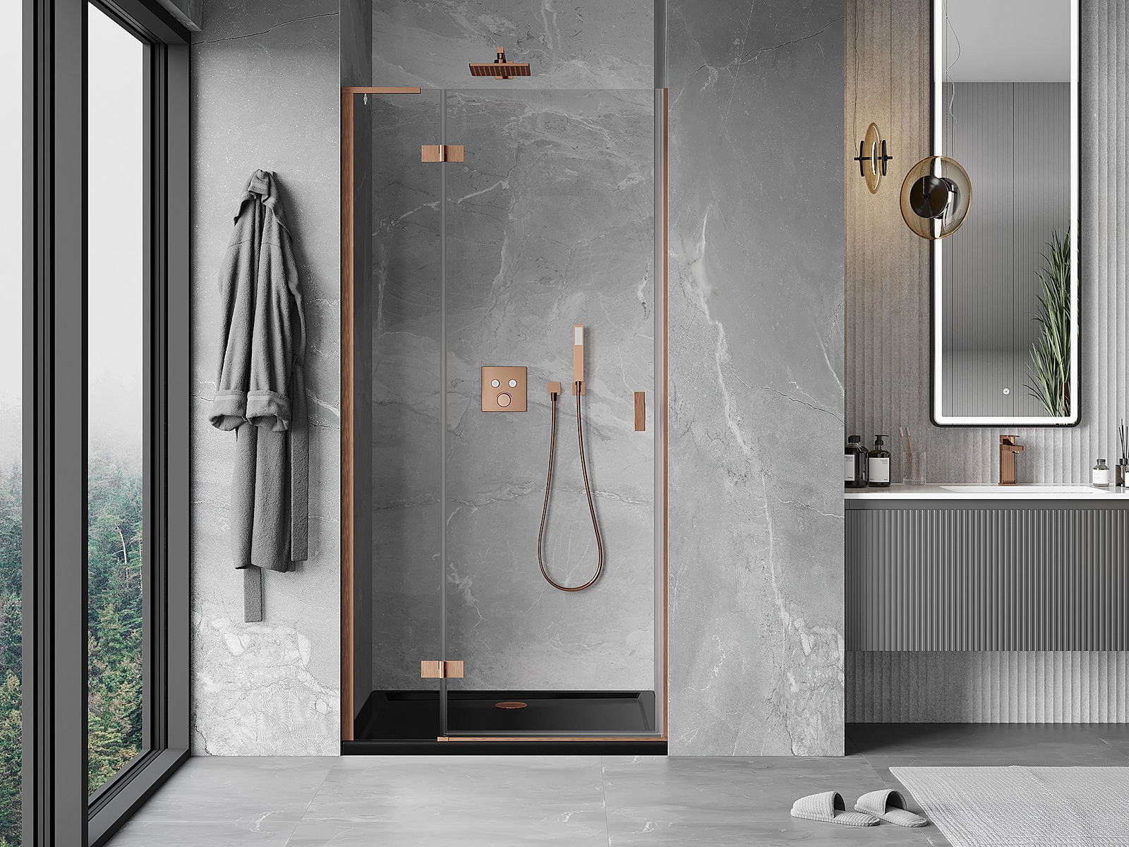 Mexen Mist-H L kreisās puses eņģu dušas durvis 95 cm, caurspīdīgas, matēta vara - 8A5L-095-000-65-00-L