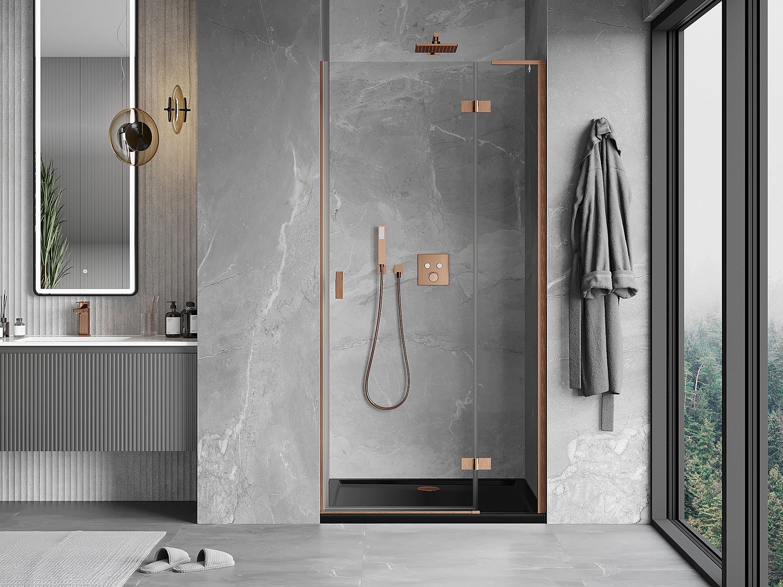 Mexen Mist-H L labās puses paceļamās dušas durvis 75 cm, caurspīdīgas, matēts varš - 8A5L-075-000-65-00-P